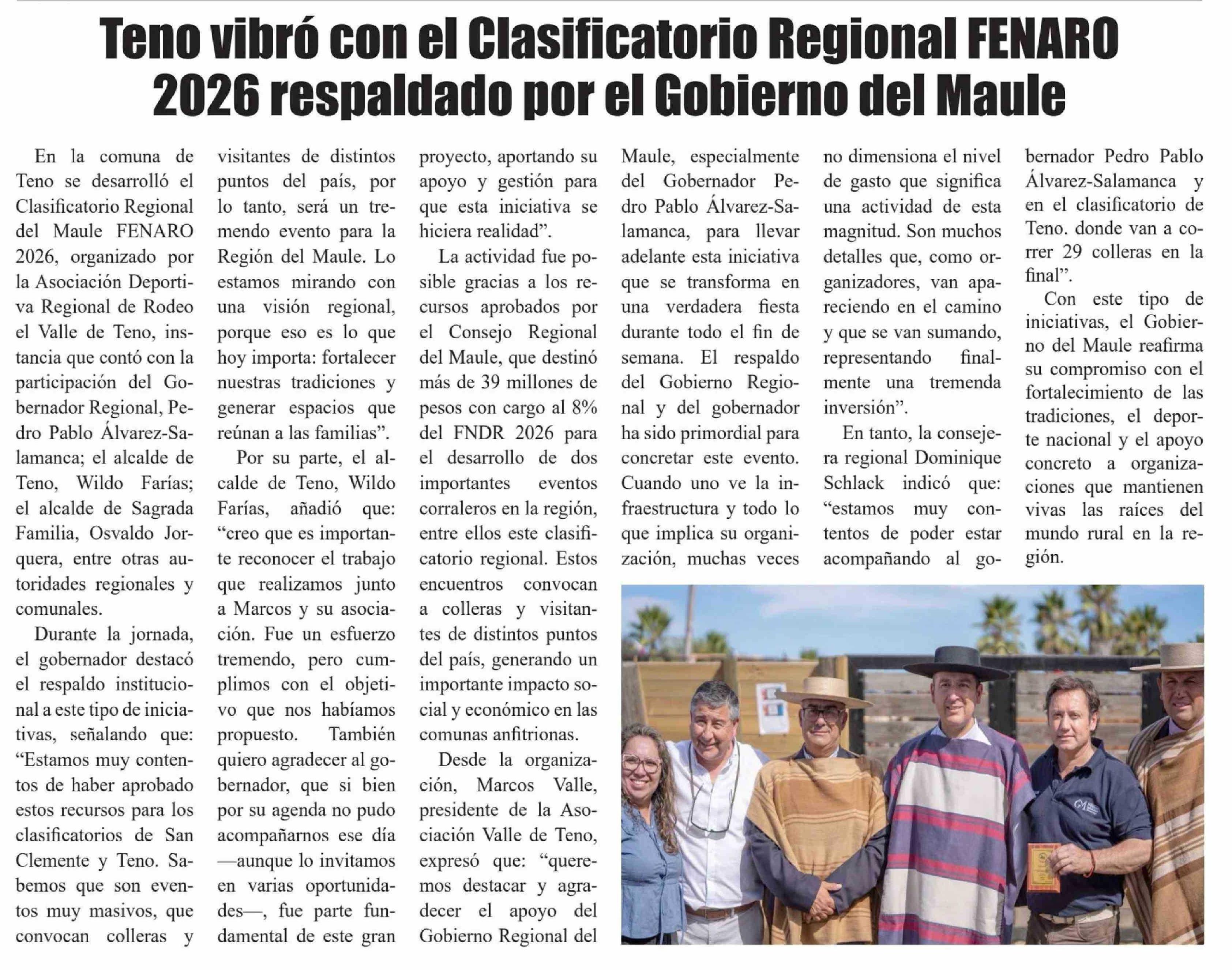 Teno vibró con el Clasificatorio Regional FENARO 2026 respaldado por el Gobierno del Maule