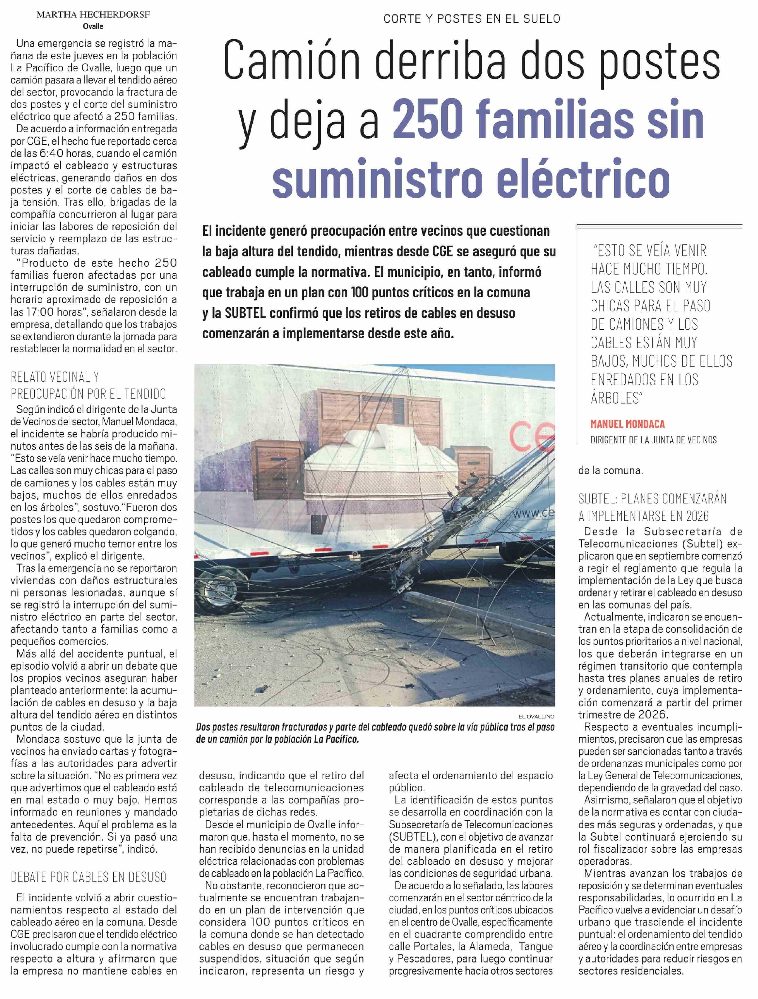 Camión derriba dos postes y deja a 250 familias sin suministro eléctrico