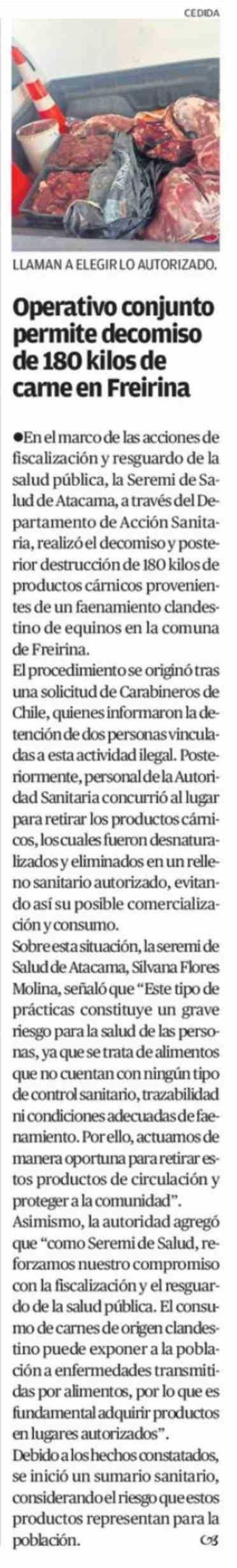 Operativo conjunto permite decomiso de 180 kilos de came en Freirina