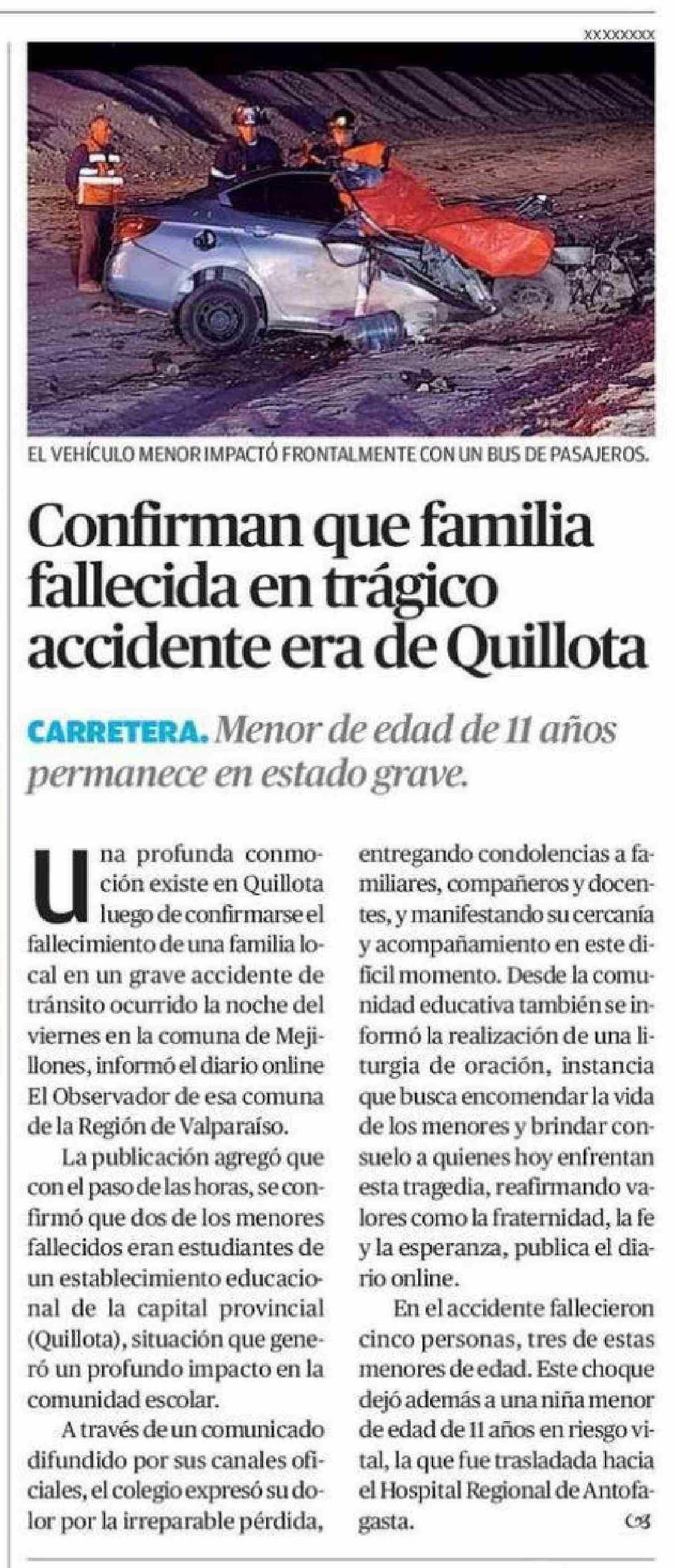 Confirman que familia fallecida en trágico accidente era de Quillota