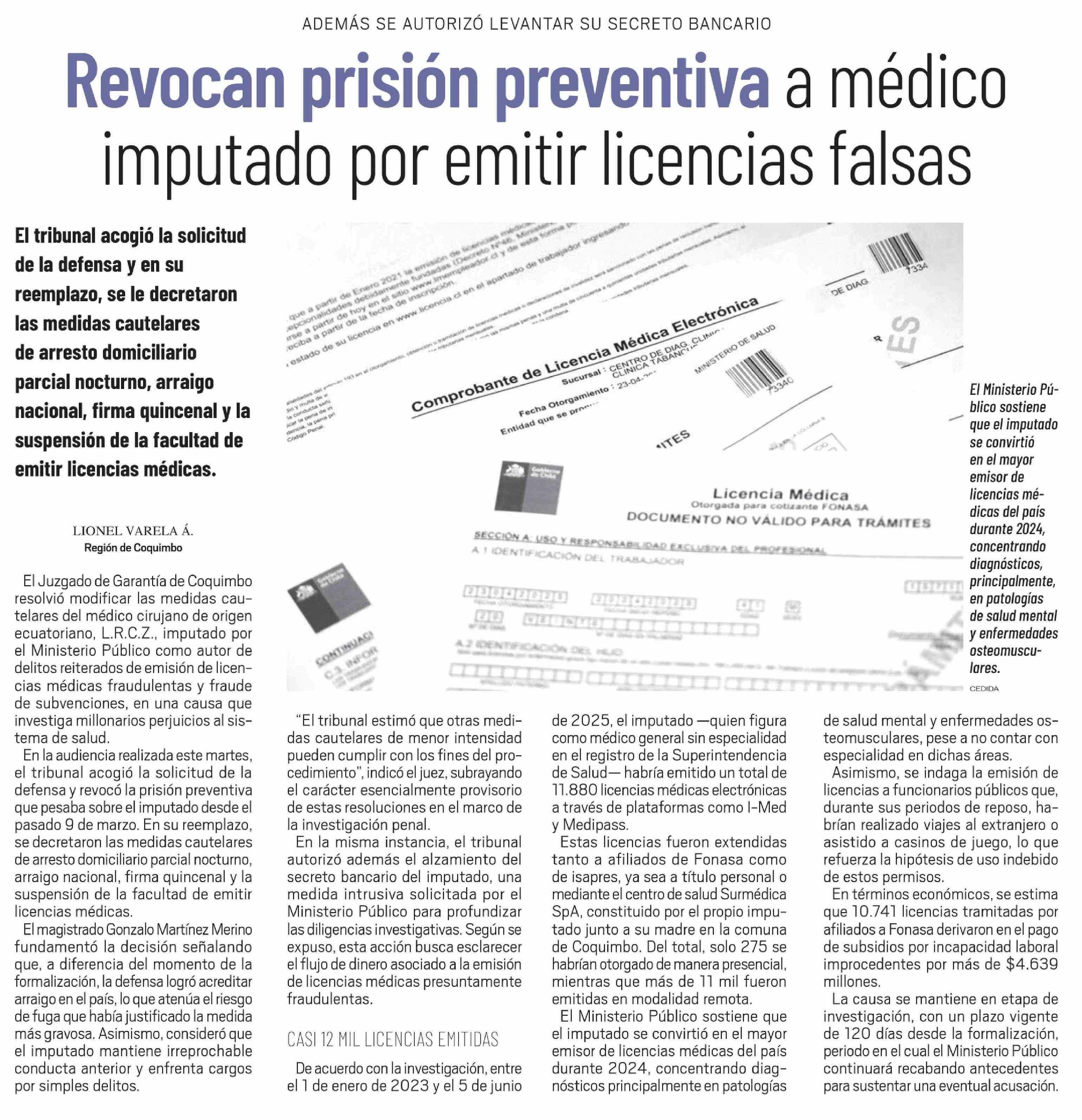 Título: Revocan prisión preventiva a médico imputado por emitir licencias falsas