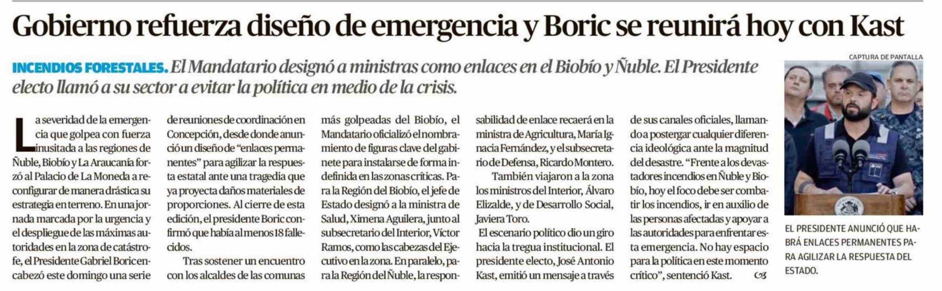Gobierno refuerza diseño de emergencia y Boric se reunirá hoy con Kast