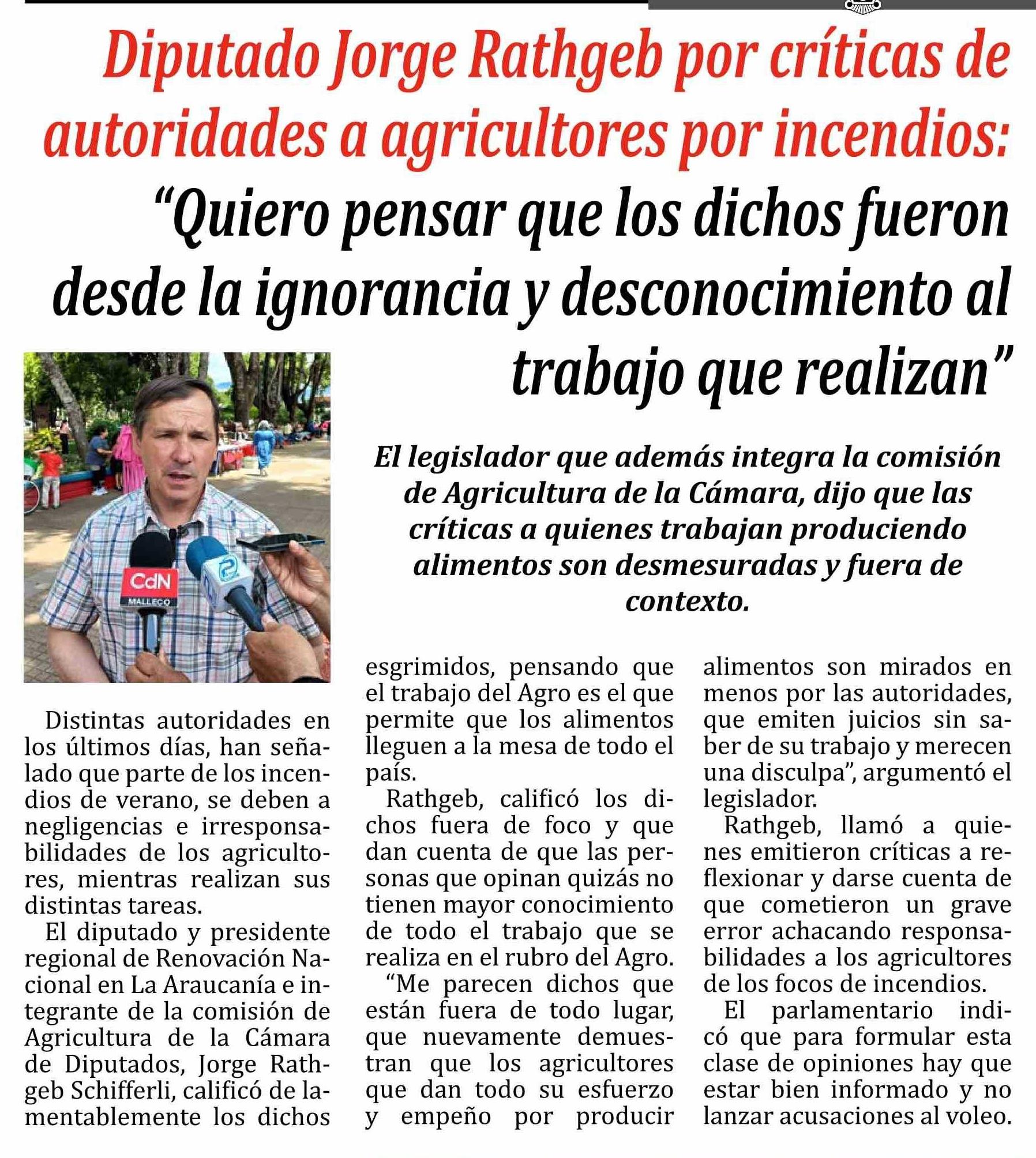 Título: Diputado Jorge Rathgeb por críticas de autoridades a agricultores por incendios: "Quiero pensar que los dichos fueron desde la ignorancia y desconocimiento al trabajo que realizan"