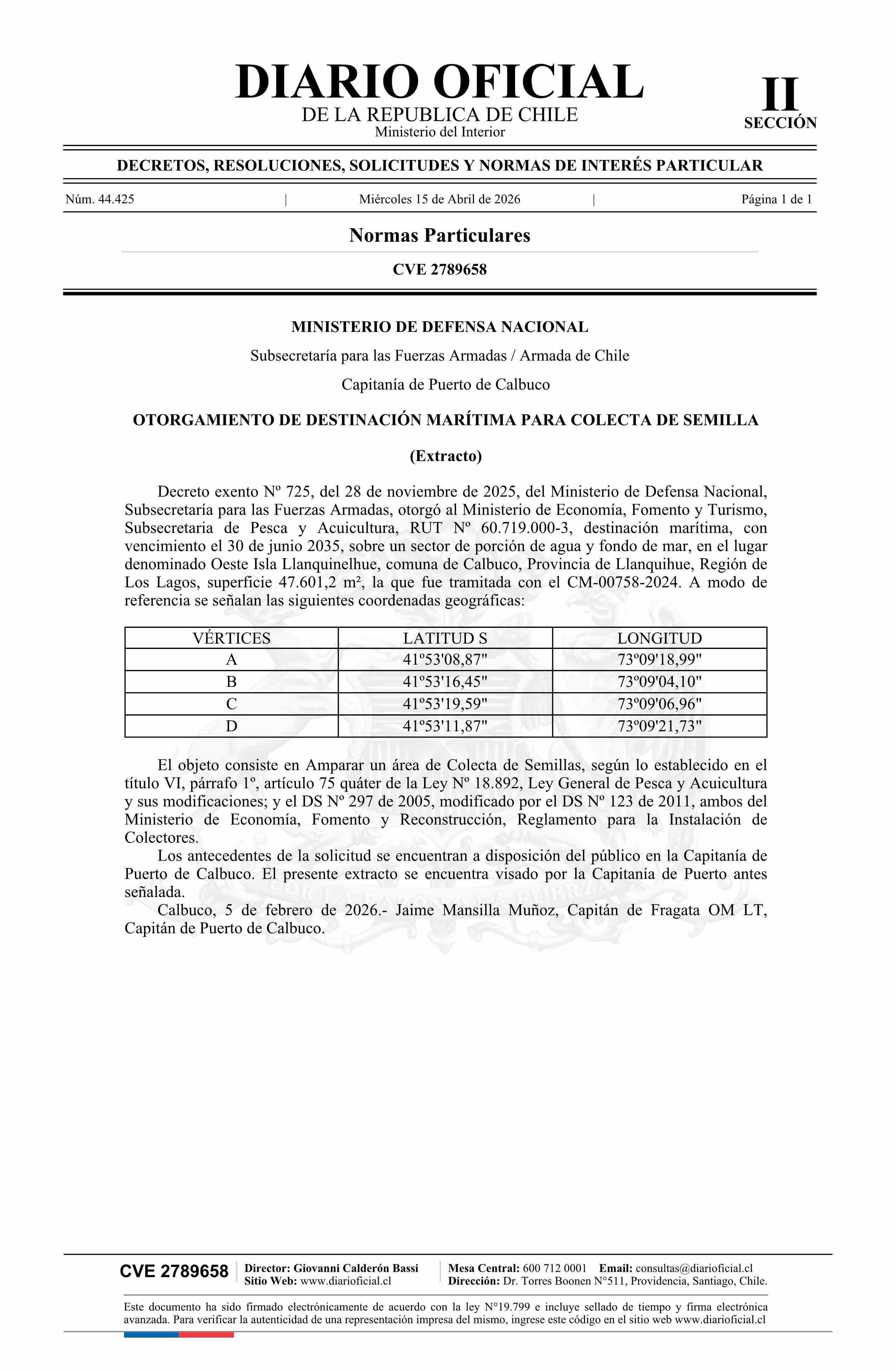 | Título: | Extracto de decreto exento número 725, de 2025.- Otorgamiento de destinación marítima para Colecta de Semilla |