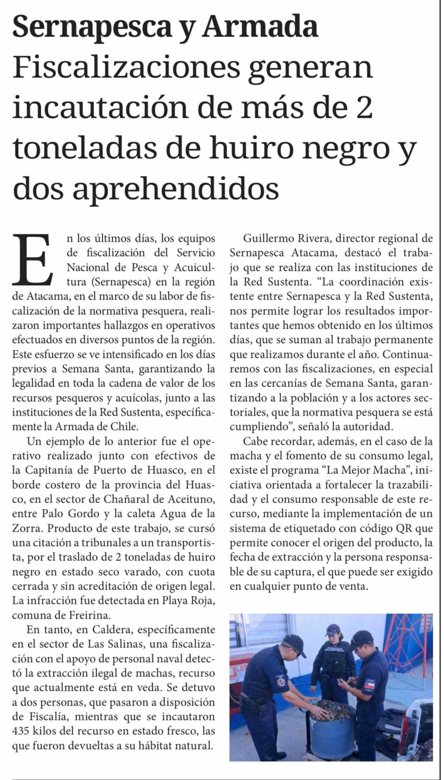 Sernapesca y Armada Fiscalizaciones generan incautación de más de 2 toneladas de huiro negro y dos aprehendidos