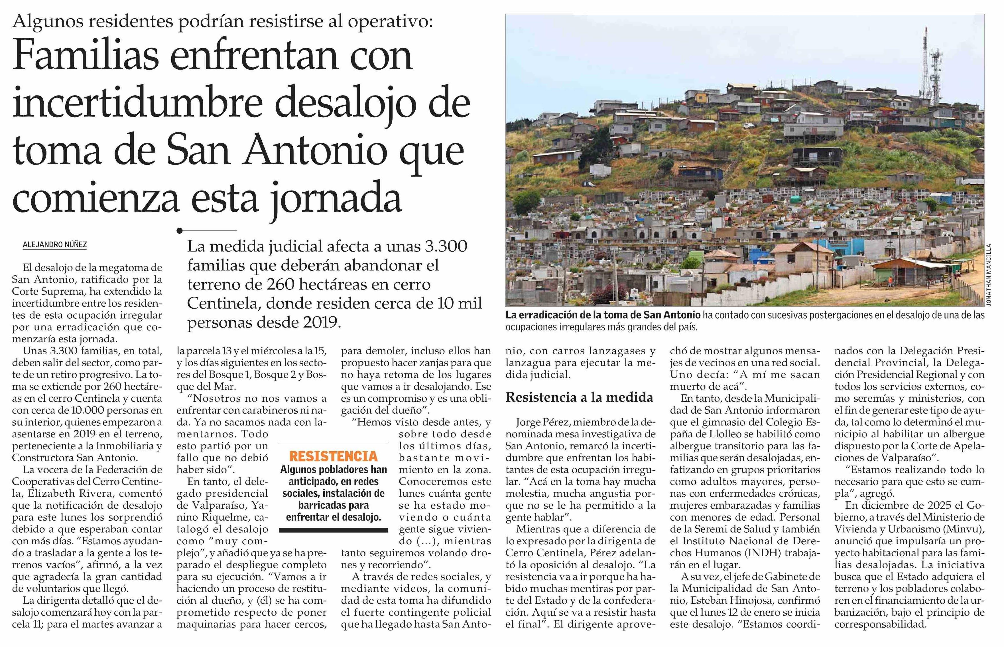 Familias enfrentan con incertidumbre desalojo de toma de San Antonio que comienza esta jornada