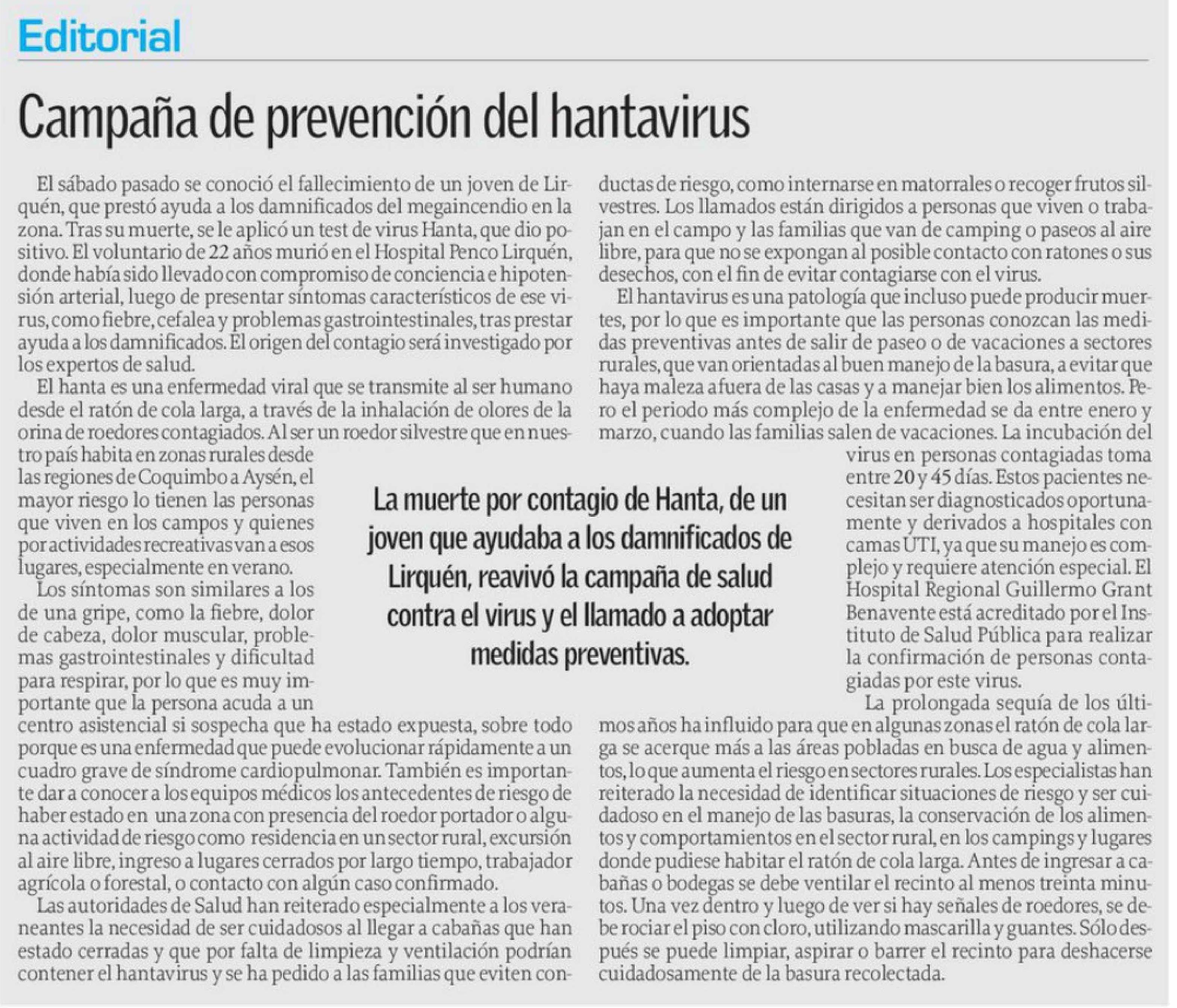 Título: Editorial: Campaña de prevención del hantavirus