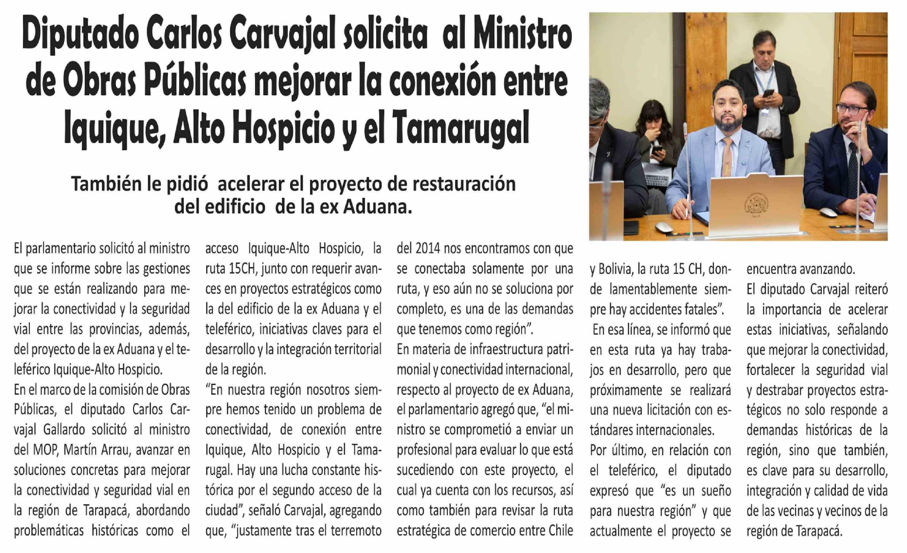 Título: Diputado Carlos Carvajal solicita al Ministro de Obras Públicas mejorar la conexión entre Iquique, Alto Hospicio y el Tamarugal