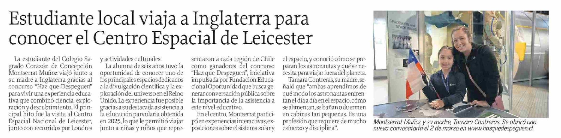 Estudiante local viaja a Inglaterra para conocer el Centro Espacial de Leicester