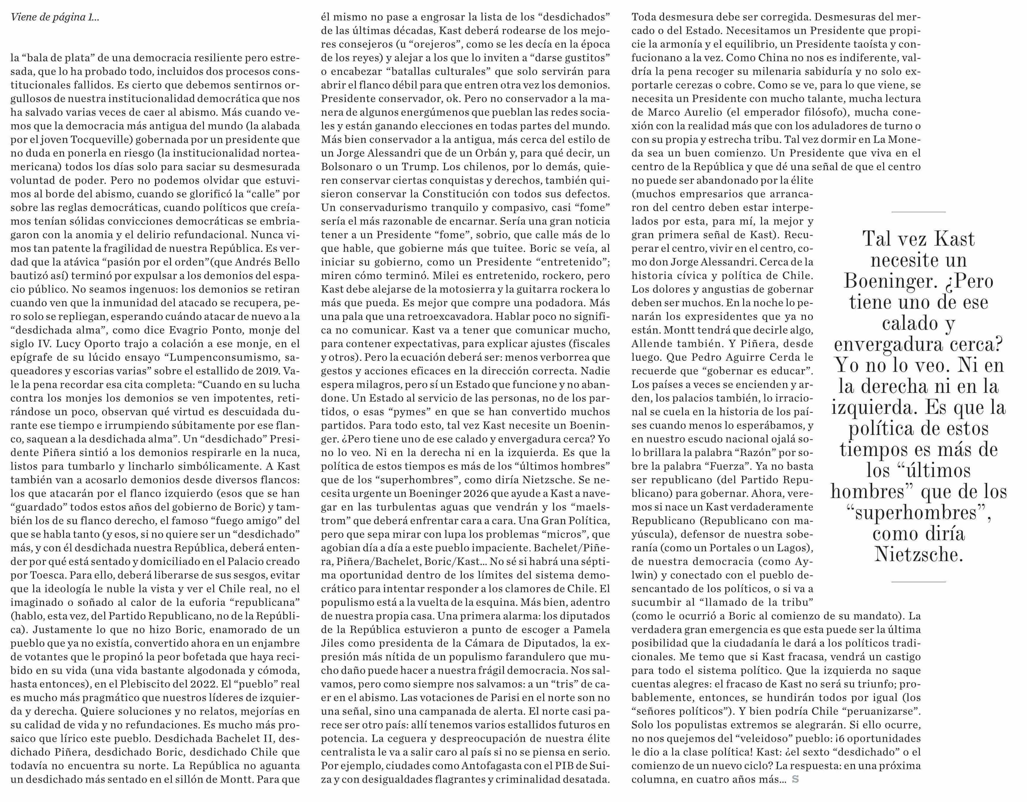 Título: la “bala de plata” de una democracia resiliente pero estresada, que lo ha probado todo, incluidos dos procesos constitucionales fallidos. Es cierto que debemos sentirnos orgullosos de nuestra institucionalidad democrática que nos ha salvado varias veces de caer al abismo. Más cuando vemos que la dem