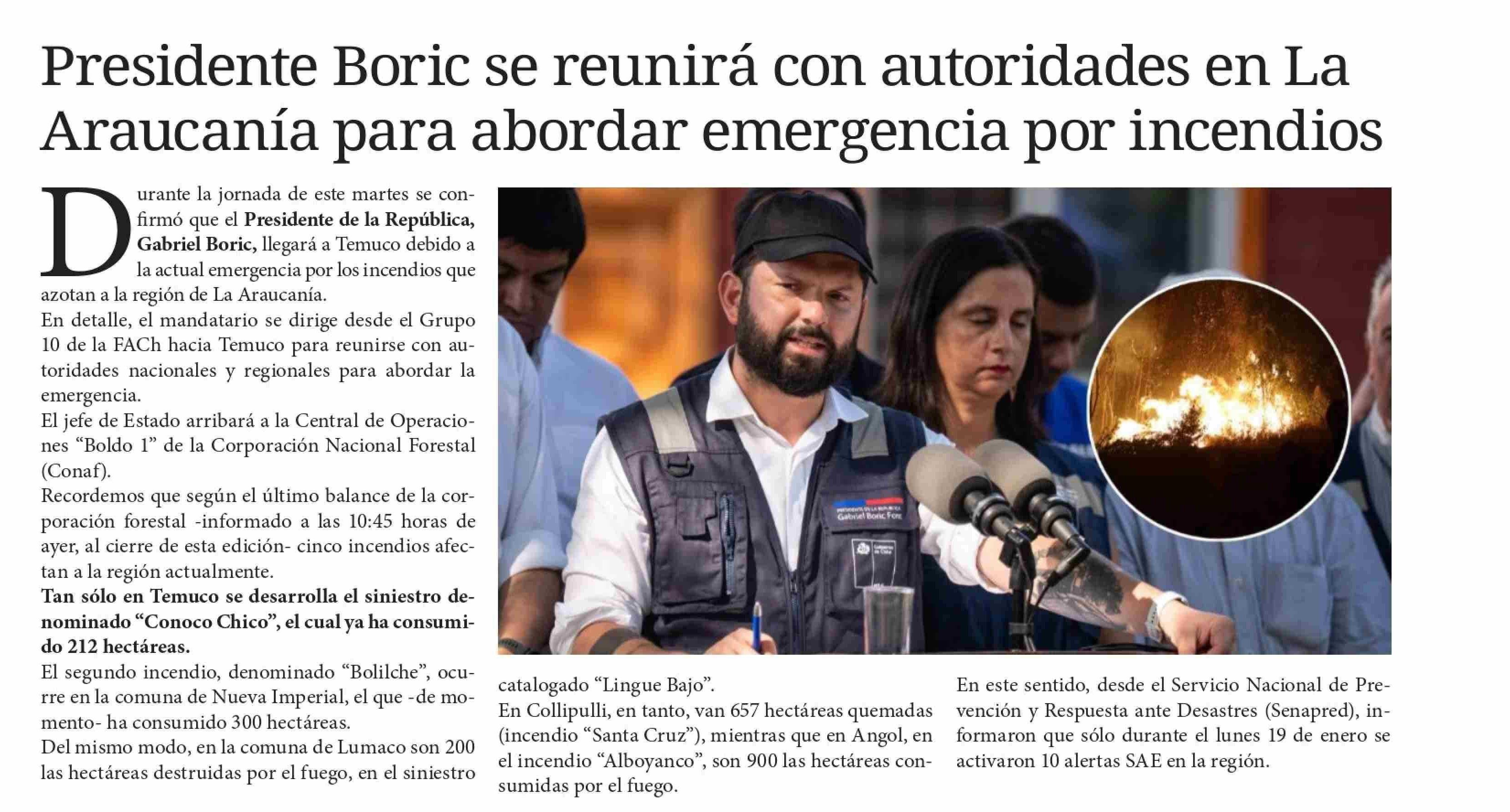 Presidente Boric se reunirá con autoridades en La Araucanía para abordar emergencia por incendios