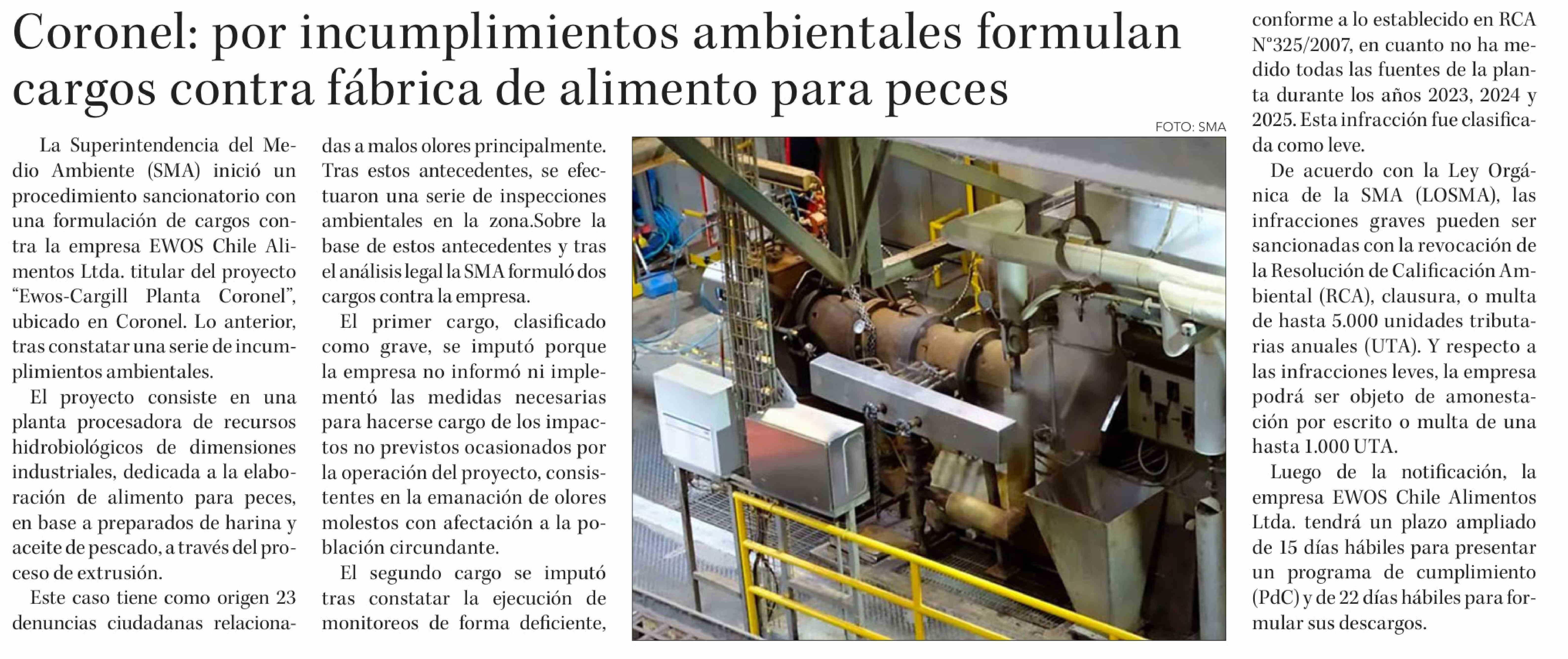 Coronel: por incumplimientos ambientales formulan cargos contra fábrica de alimento para peces