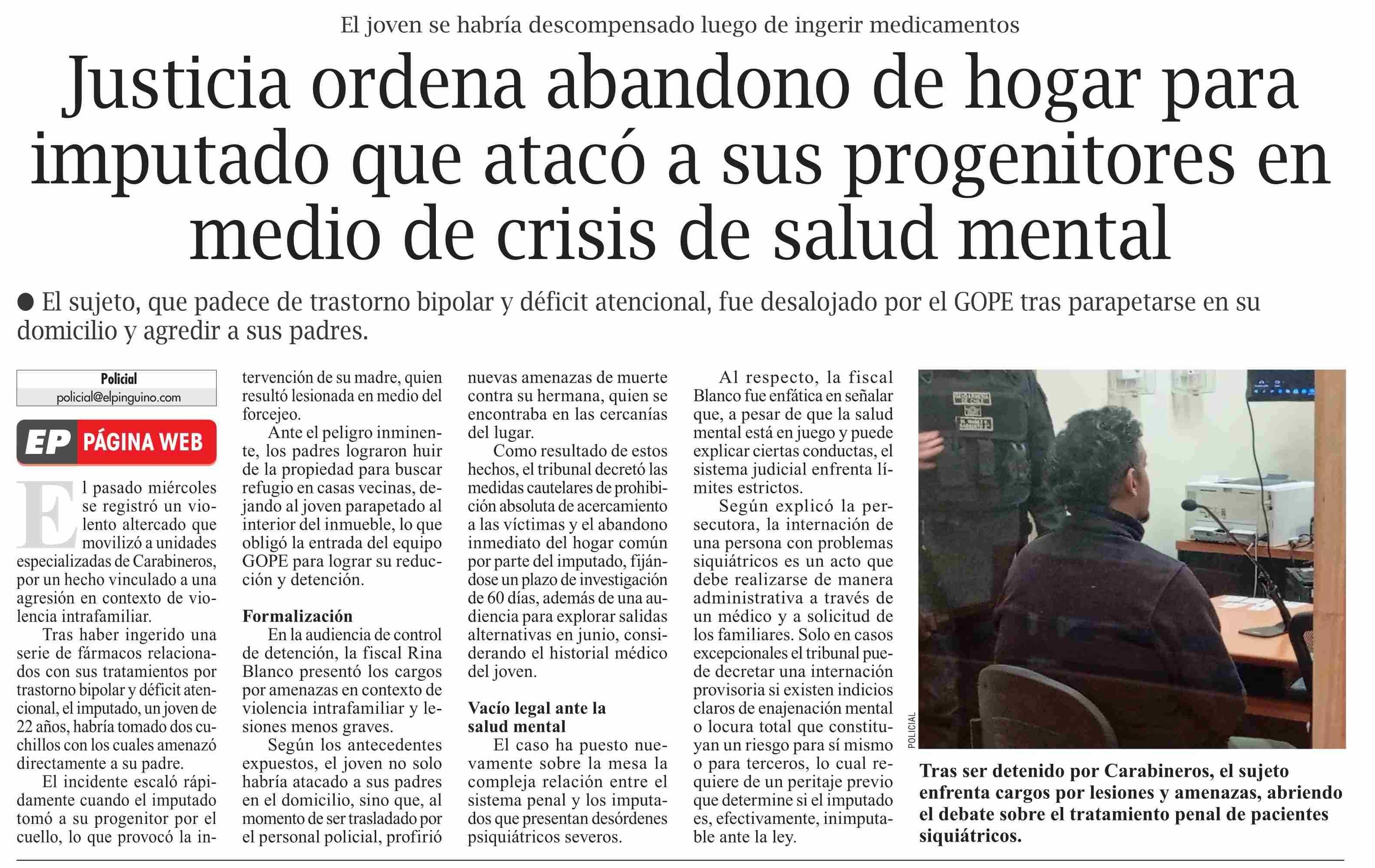 Justicia ordena abandono de hogar para imputado que atacó a sus progenitores en medio de crisis de salud mental