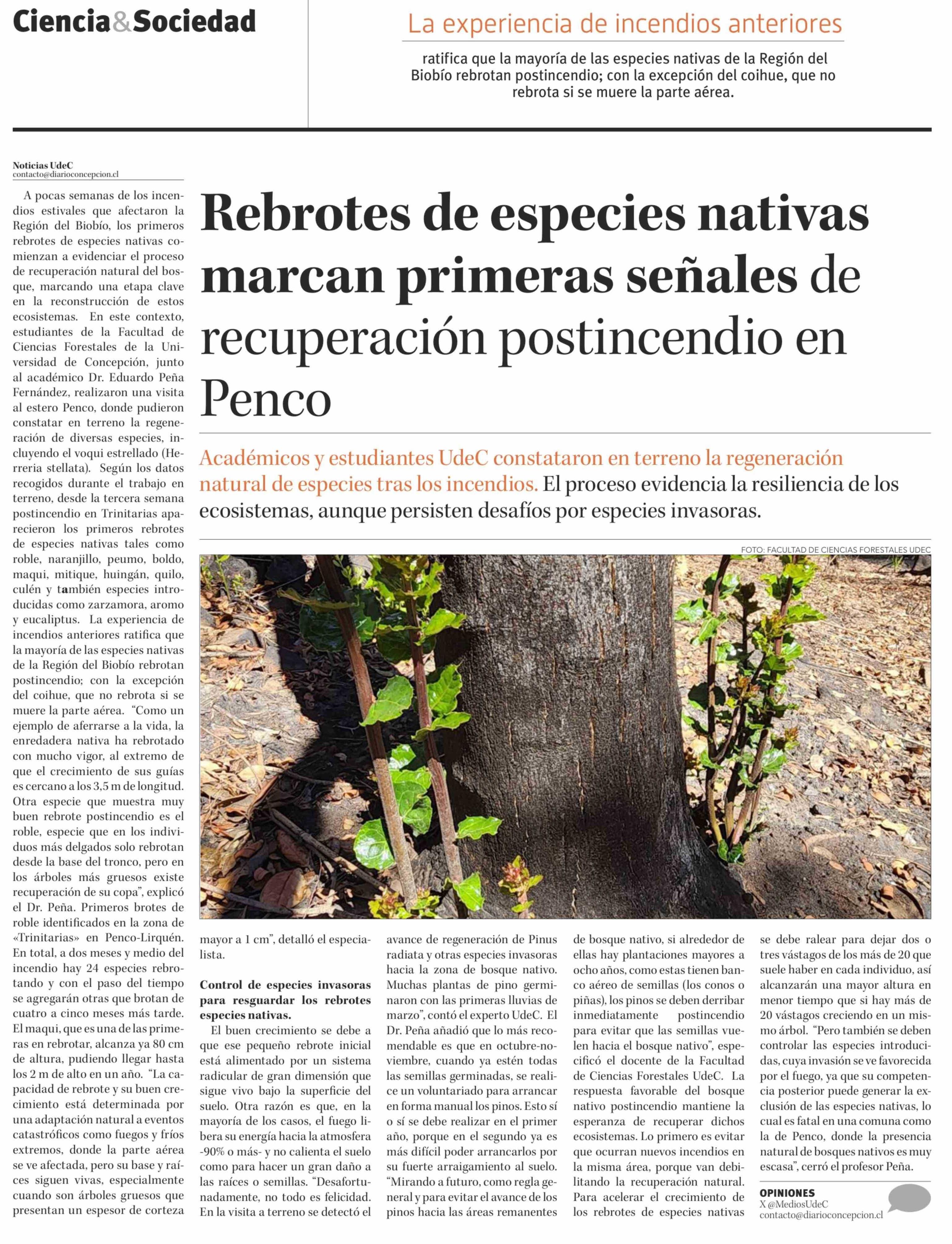 Rebrotes de especies nativas marcan primeras señales de recuperación postincendio en Penco