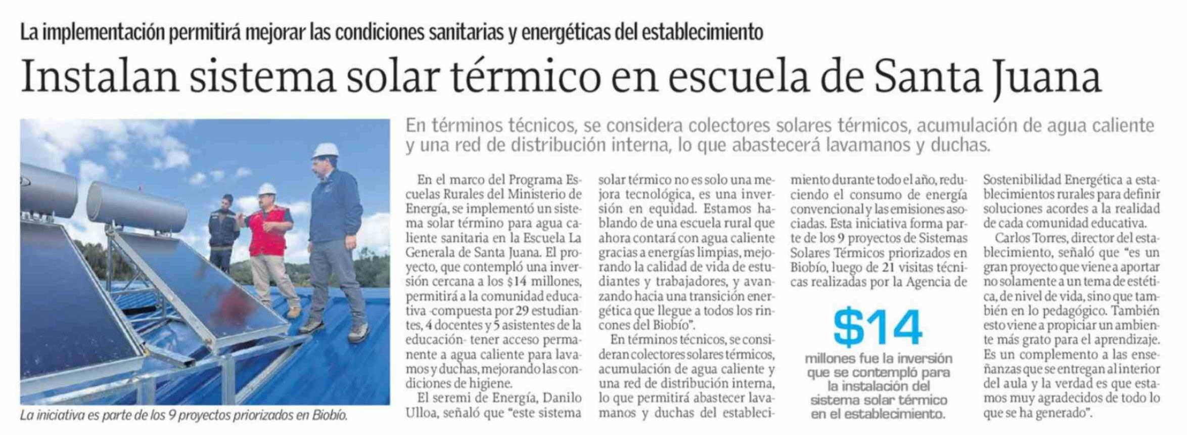Instalan sistema solar térmico en escuela de Santa Juana