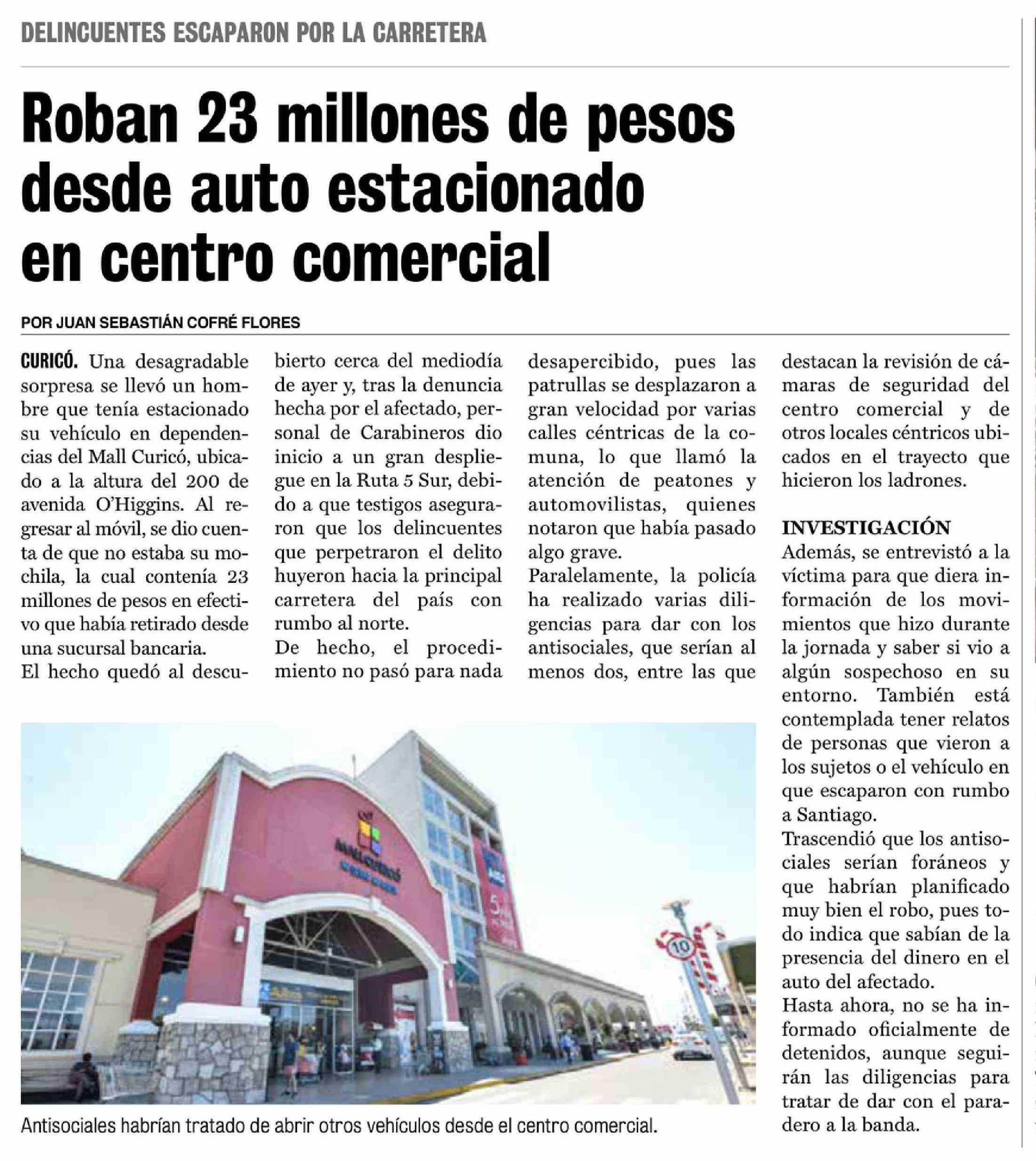 Roban 23 millones de pesos desde auto estacionado en centro comercial