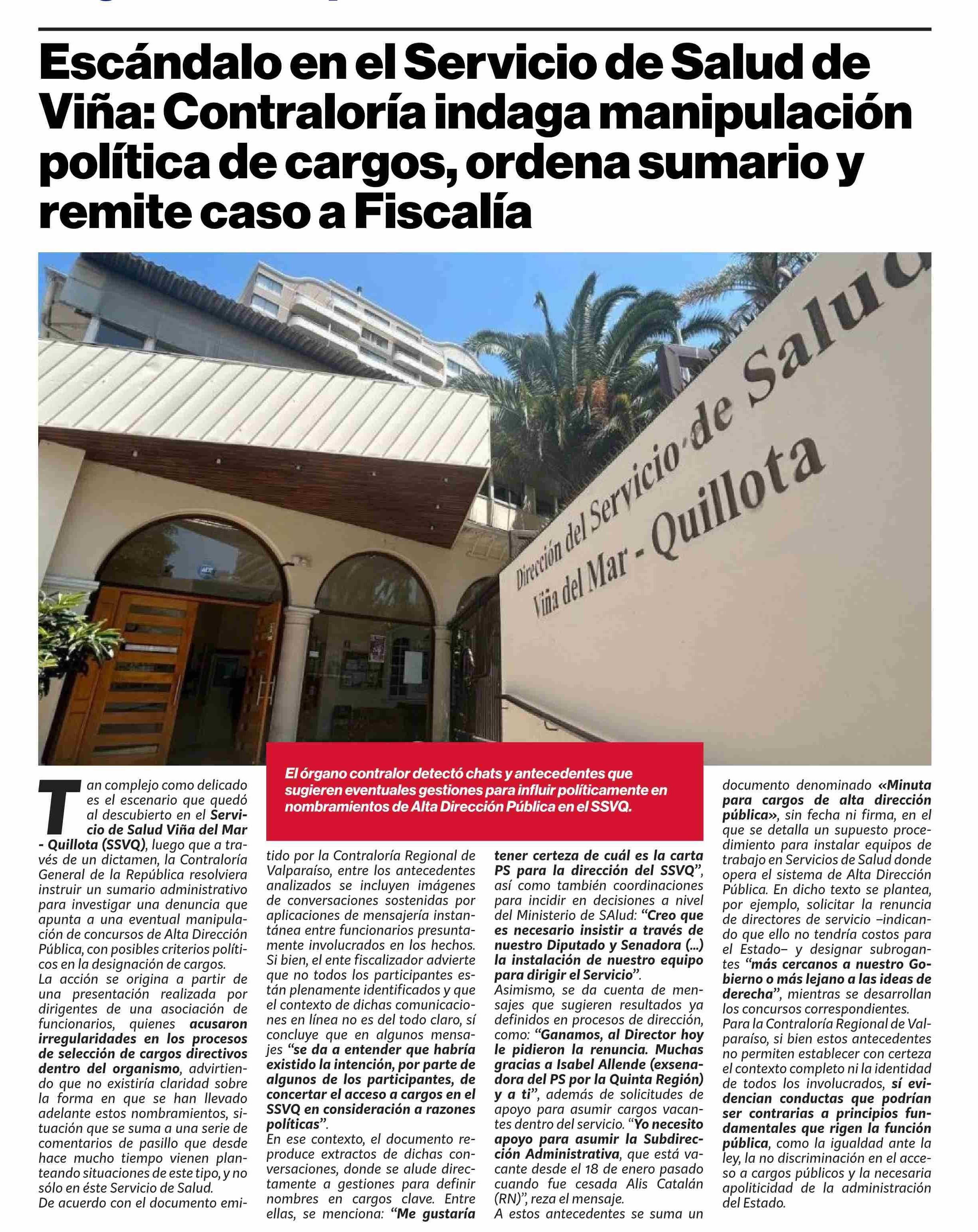 Título: Escándalo en el Servicio de Salud de Viña: Contraloría indaga manipulación política de cargos, ordena sumario y remite caso a Fiscalía