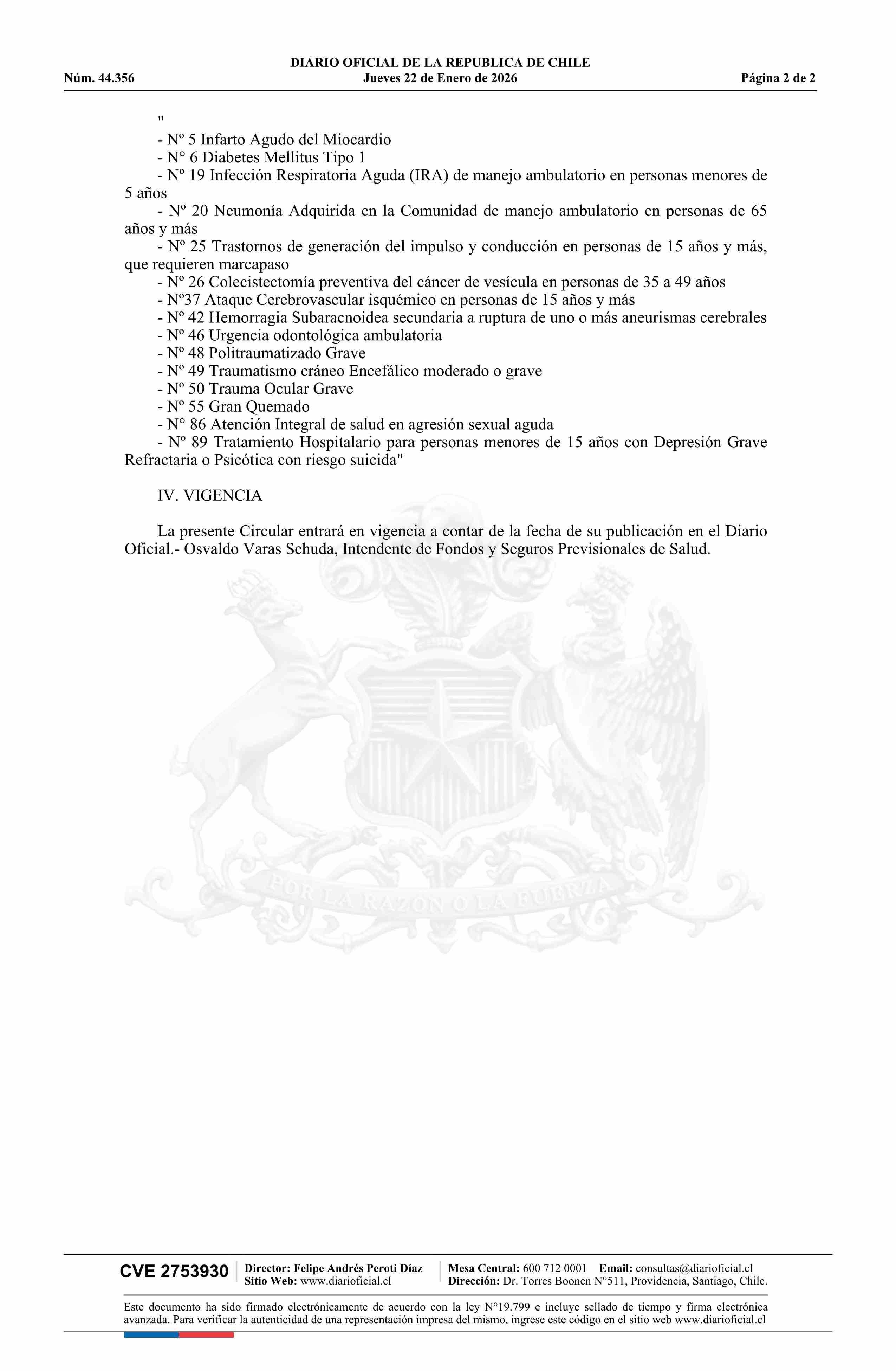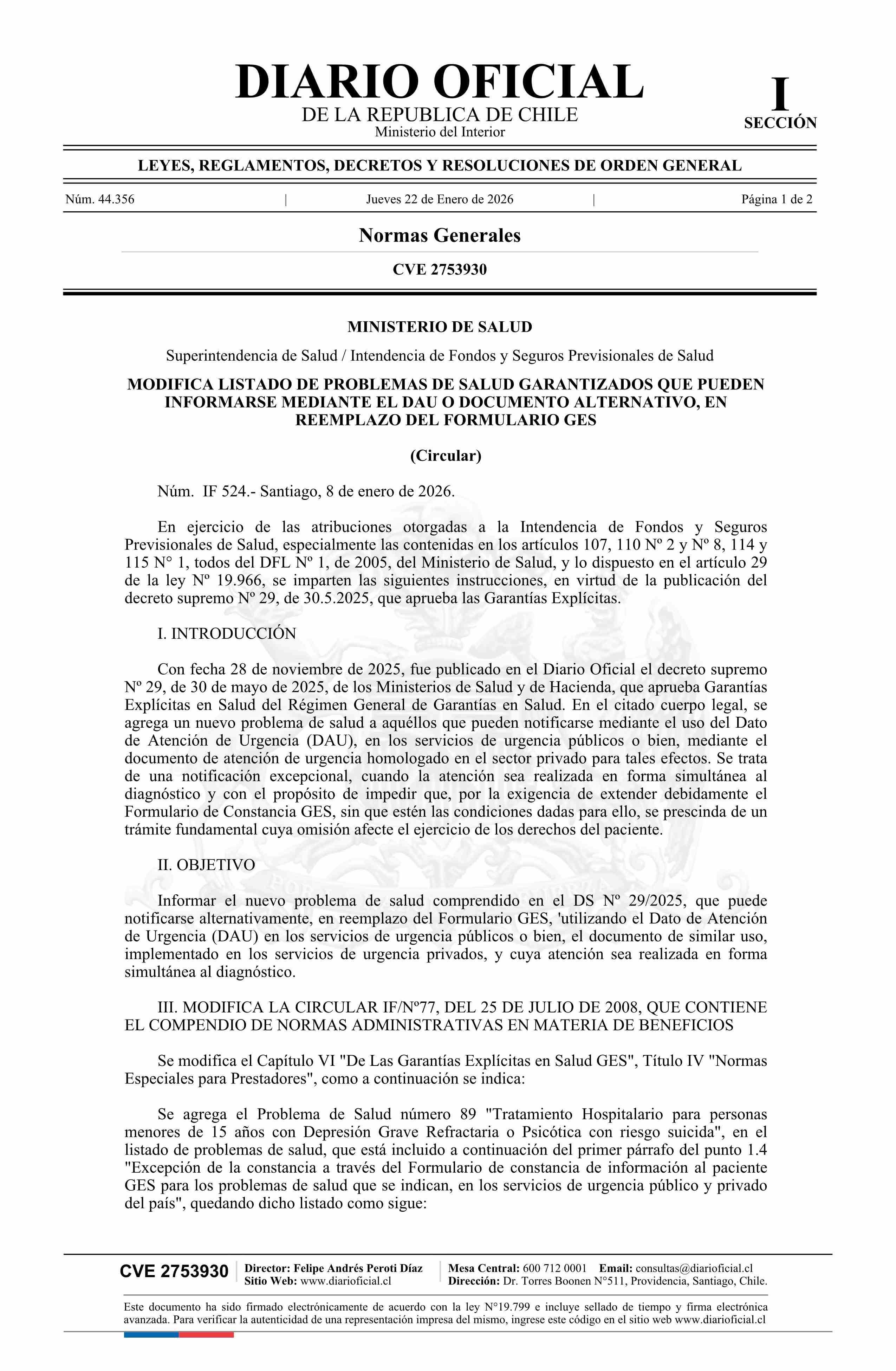| Título: | Circular número IF 524, de 2026.- Modifica listado de problemas de salud garantizados que pueden informarse mediante el Dau o documento alternativo, en reemplazo del formulario GES |