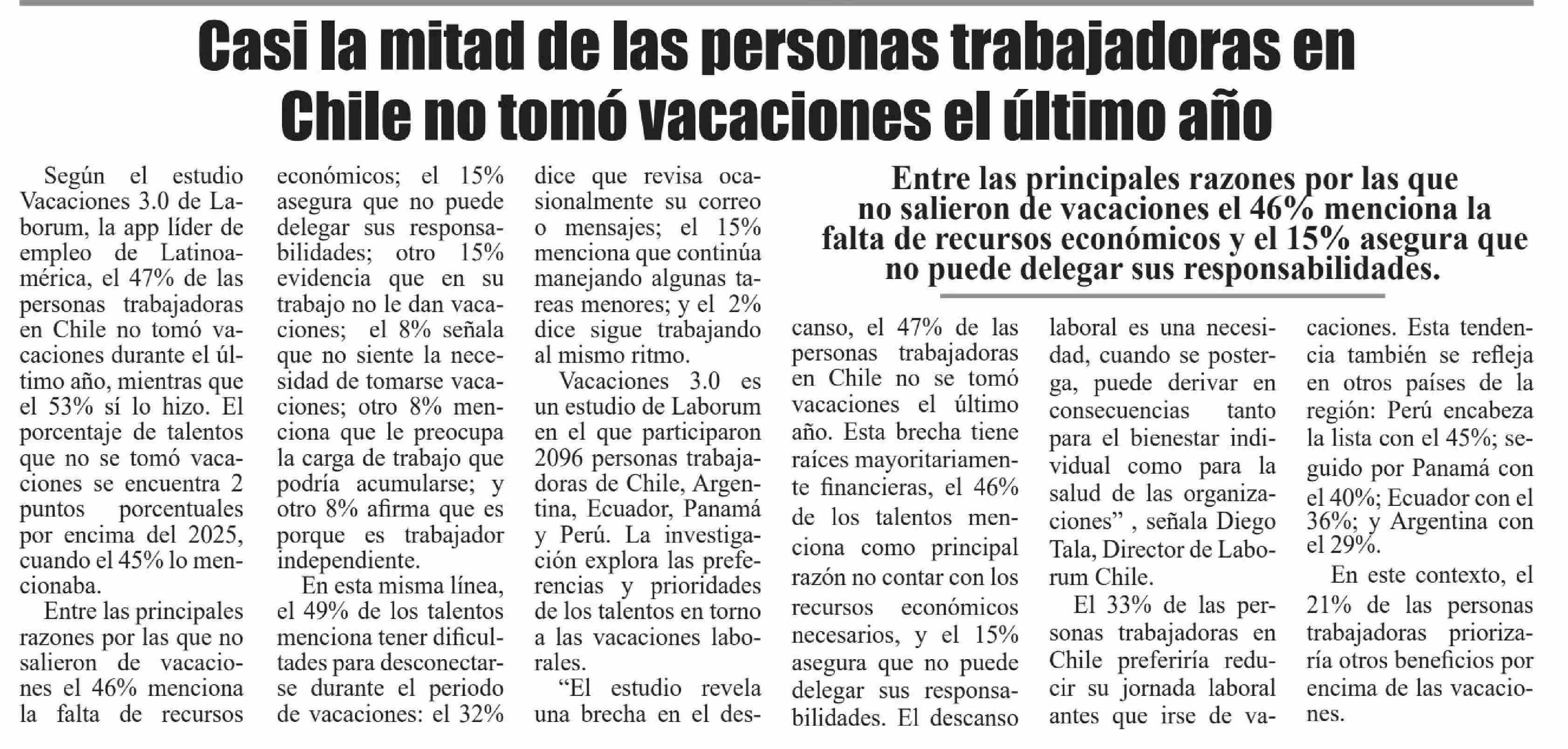 Casi la mitad de las personas trabajadoras en Chile no tomó vacaciones el último año