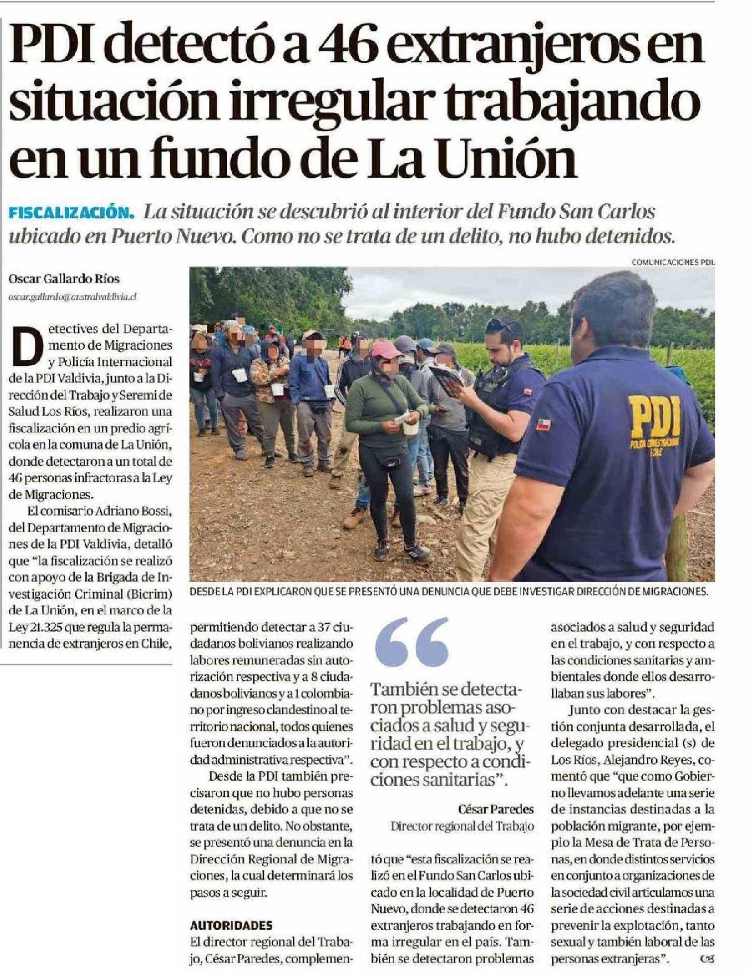 PDI detectó a 46 extranjeros en situación irregular trabajando en un fundo de La Unión