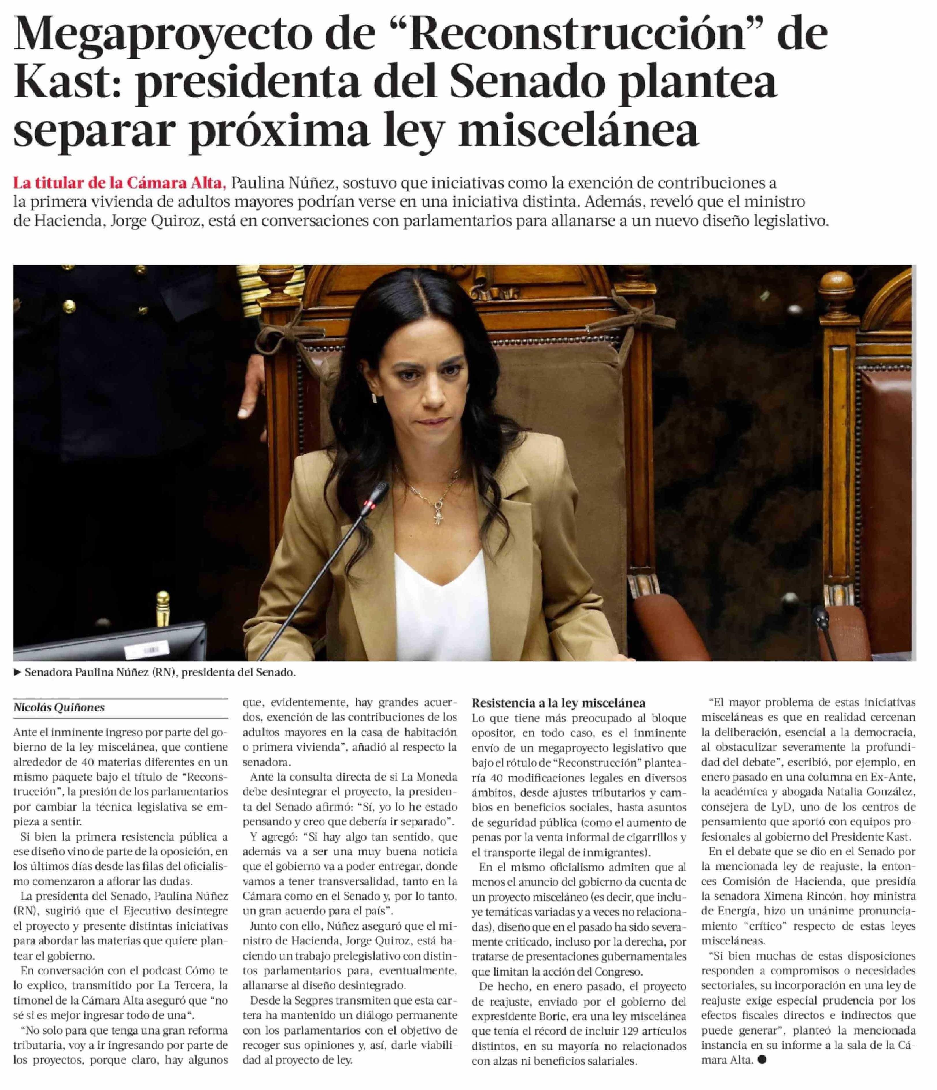 Megaproyecto de "Reconstrucción" de Kast: presidenta del Senado plantea separar próxima ley miscelánea