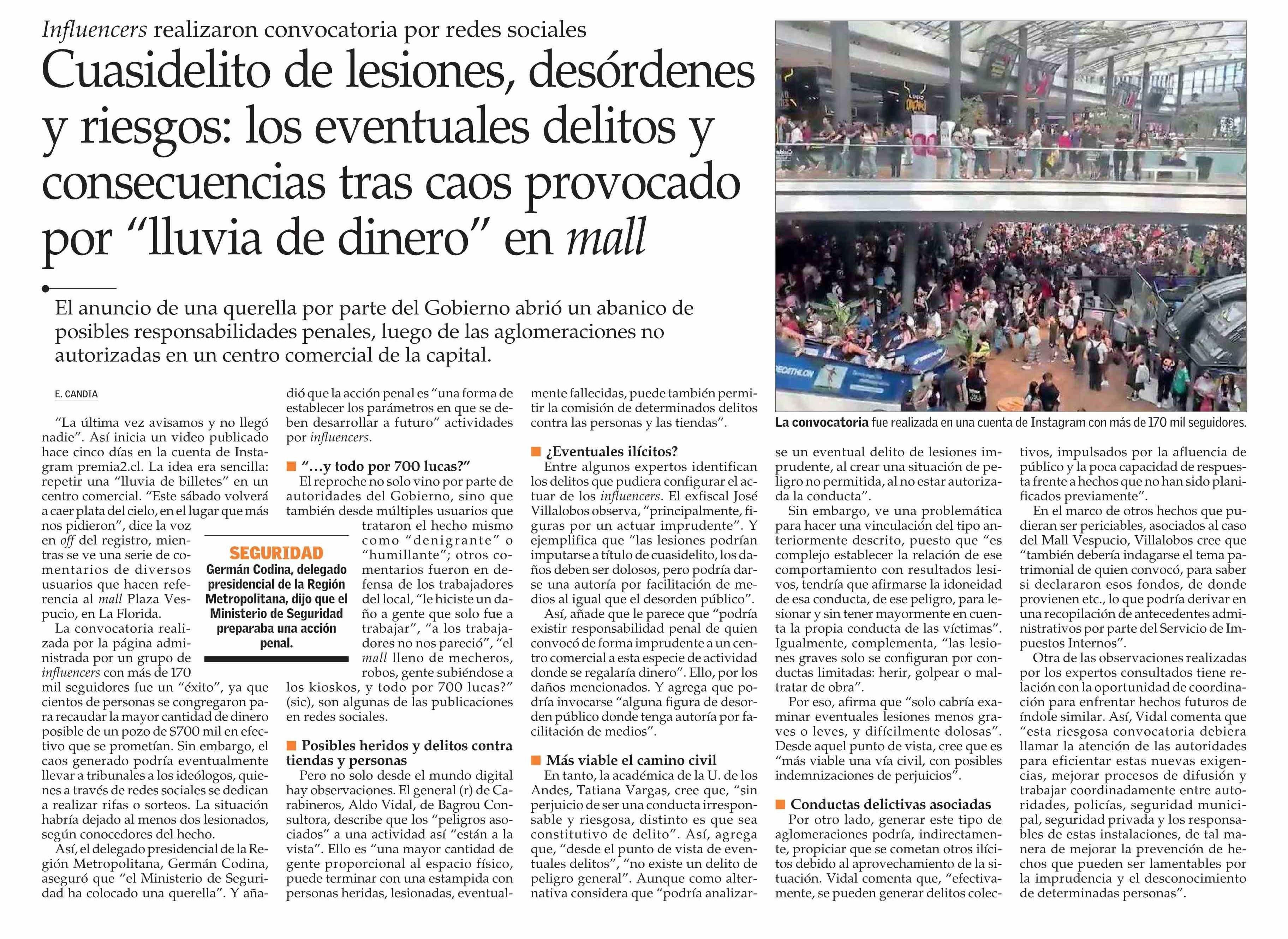 | Título: | Cuasidelito de lesiones, desórdenes y riesgos: los eventuales delitos y consecuencias tras caos provocado por “lluvia de dinero” en mall |