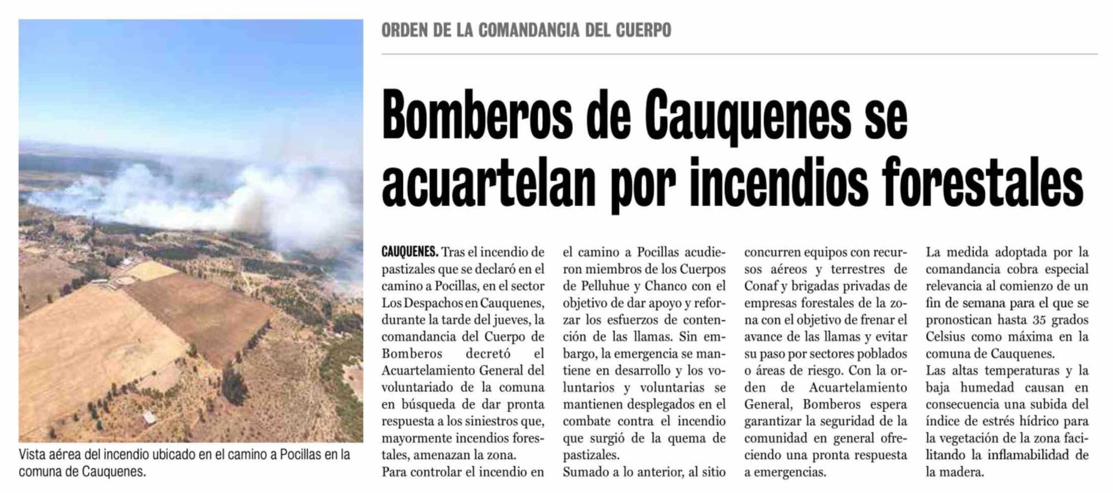 Bomberos de Cauquenes se acuartelan por incendios forestales