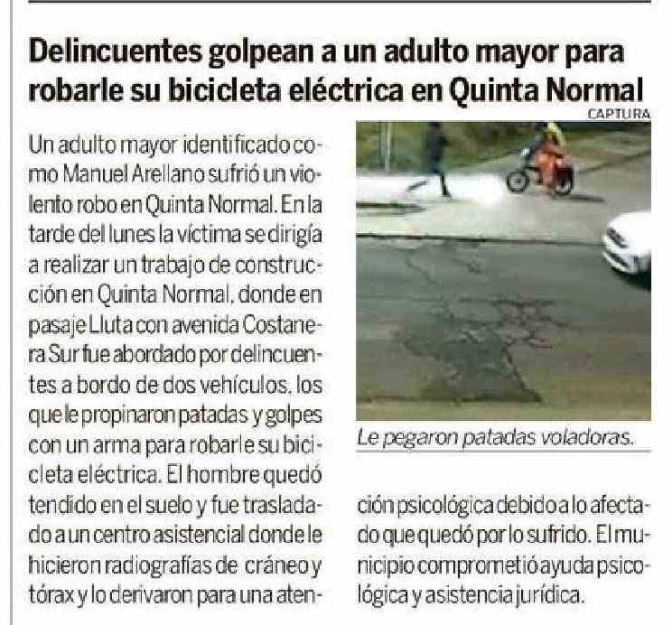 Delincuentes golpean a un adulto mayor para robarle su bicicleta eléctrica en Quinta Normal