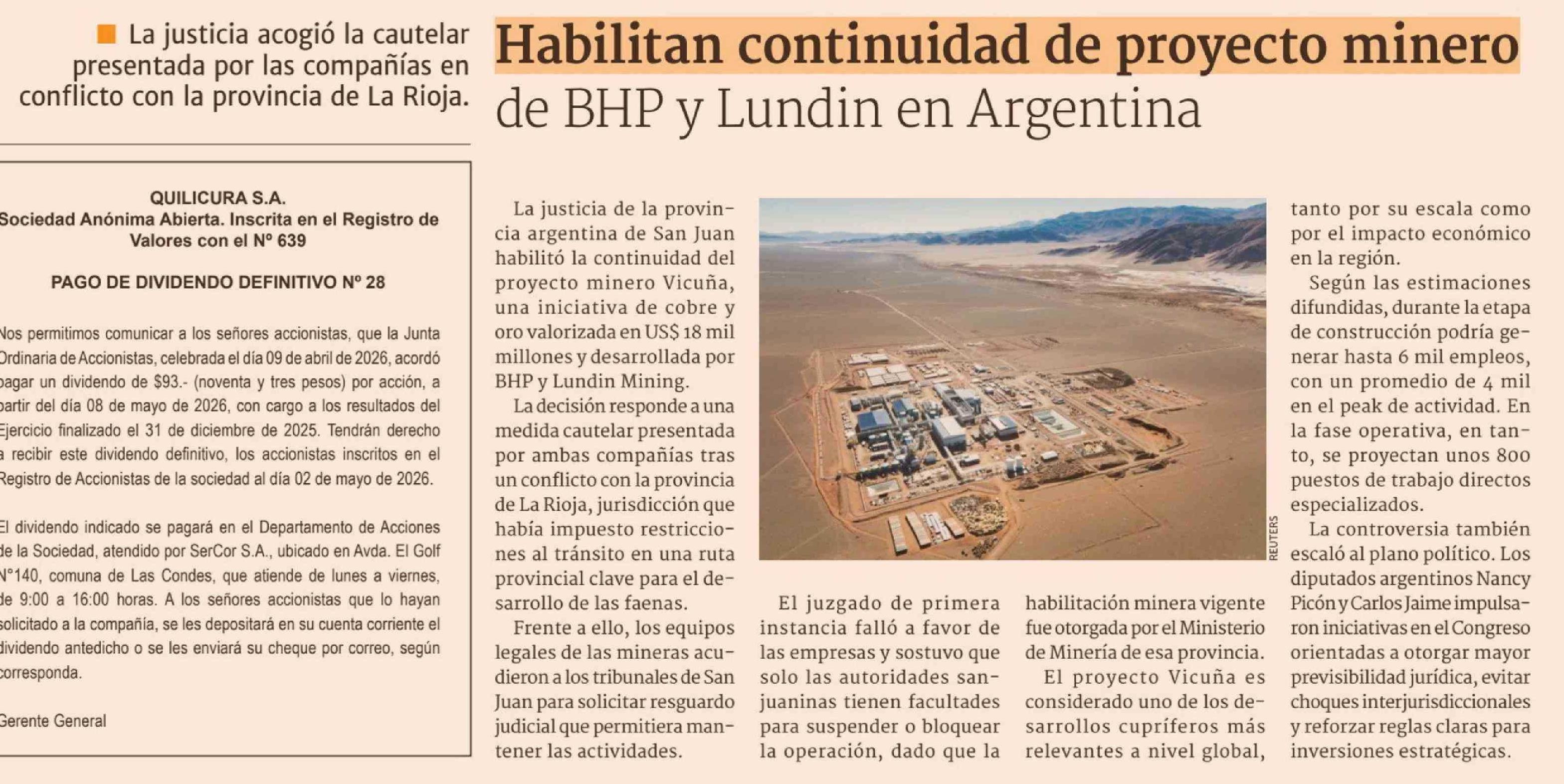 Habilitan continuidad de proyecto minero de BHP y Lundin en Argentina