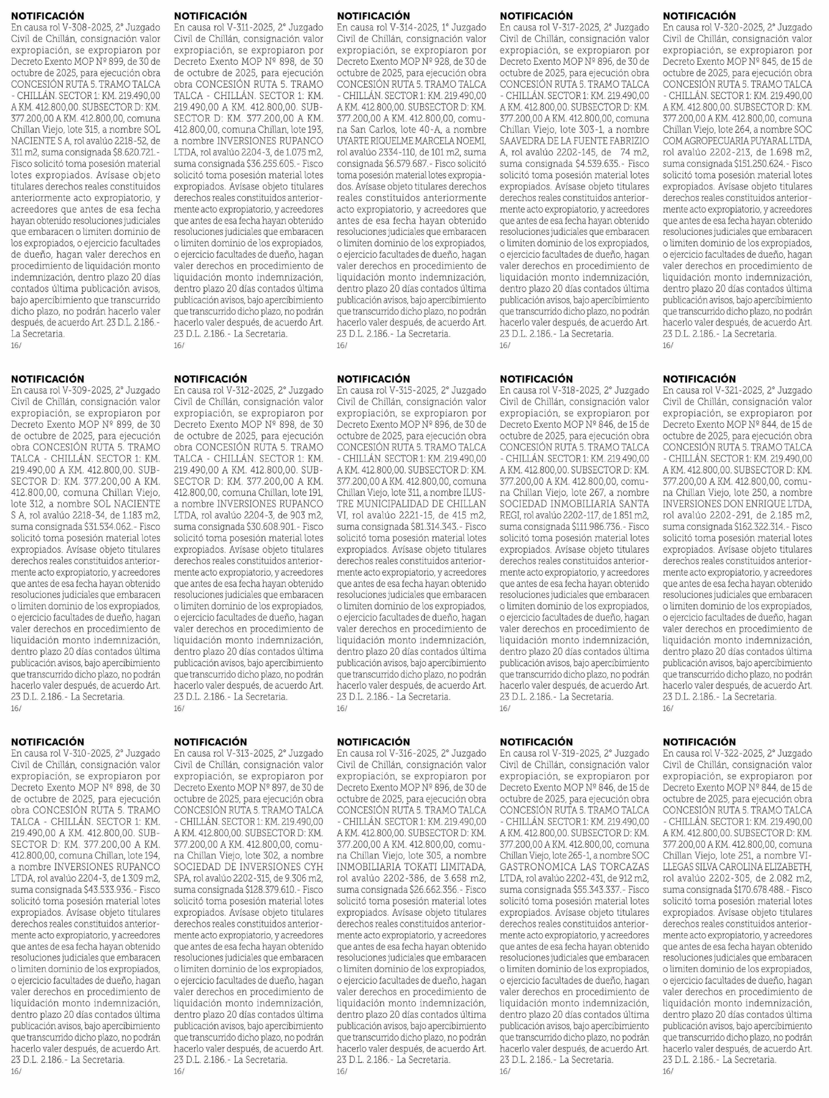 Título: NOTIFICACIÓN En causa rol V-309-2025, 2° Juzgado Civil de Chillán, consignación valor expropiación, se expropiaron por Decreto Exento MOP Nº 899, de 30 de octubre de 2025, para ejecución obra CONCESIÓN RUTA 5. TRAMO TALCA - CHILLÁN. SECTOR 1: KM. 219.490,00 AKM. 412.800,00. SUBSECTOR D: KM. 377.200,
