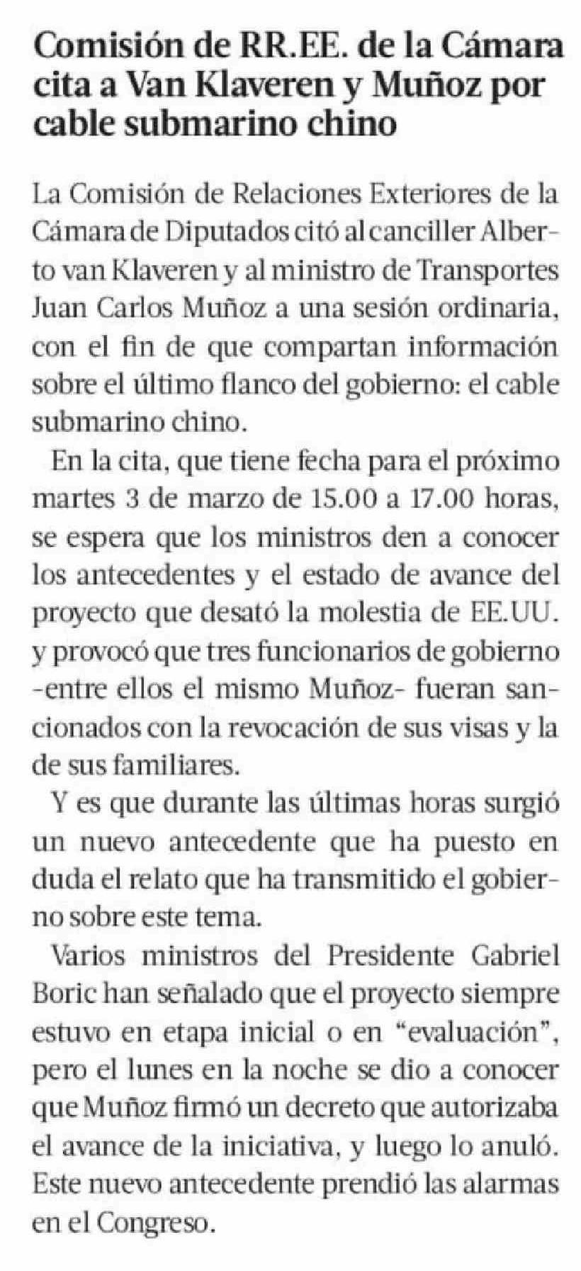 Comisión de RR.EE. de la Cámara cita a Van Klaveren y Muñoz por cable submarino chino