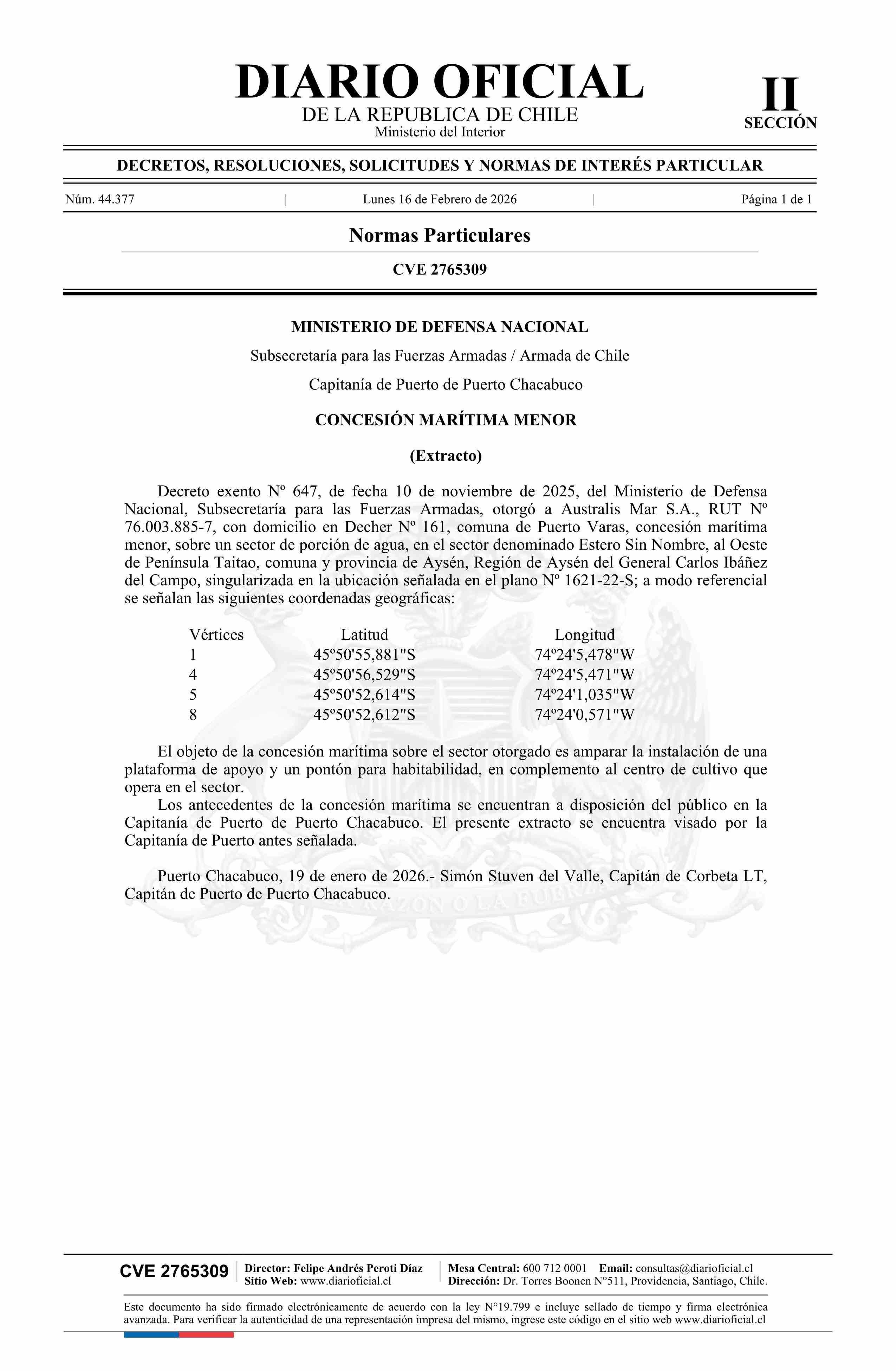 | Título: | Extracto de decreto exento número 647, de 2025.- Otorgamiento de concesión marítima menor |