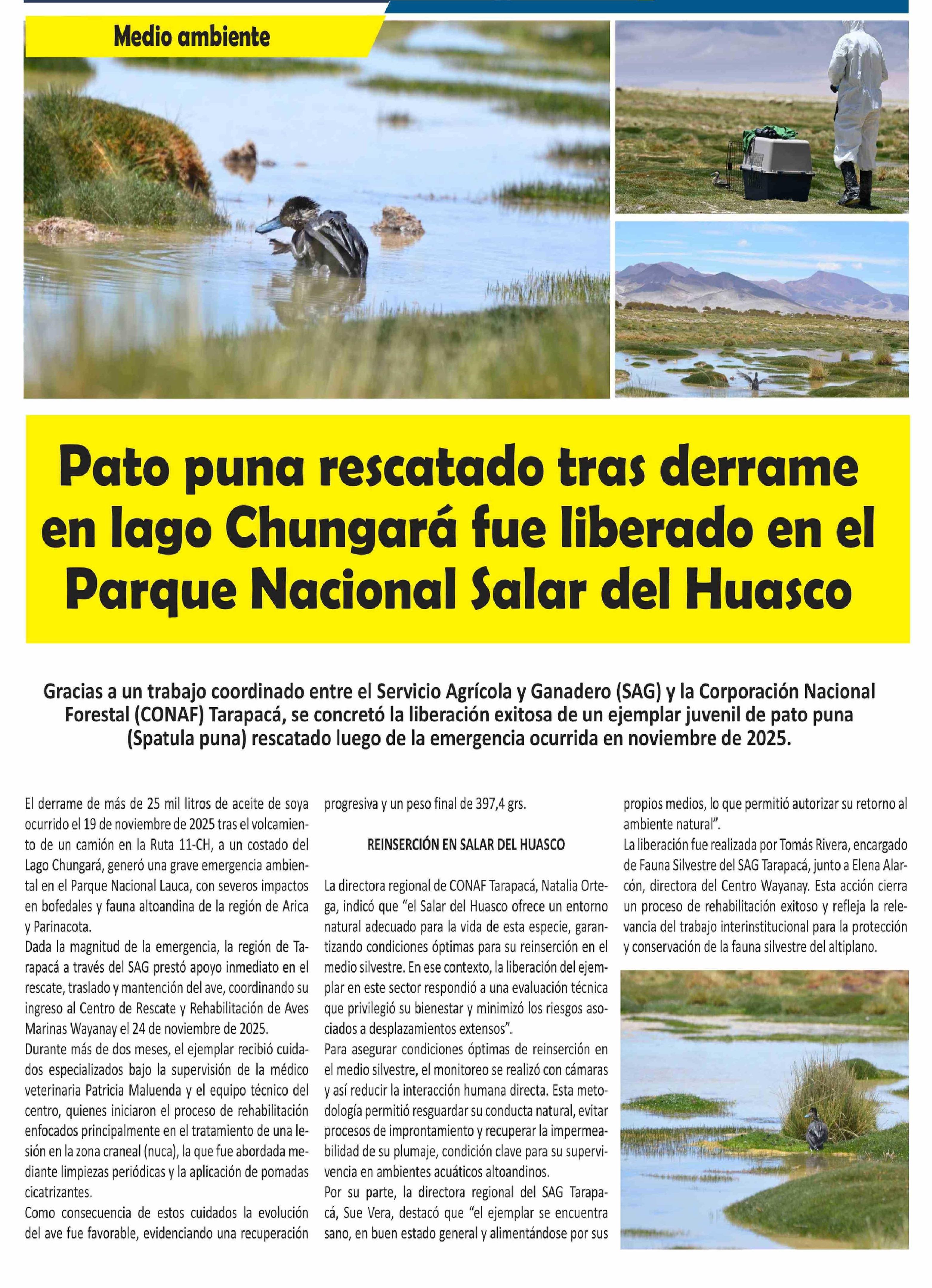 Pato puna rescatado tras derrame en lago Chungará fue liberado en el Parque Nacional Salar del Huasco