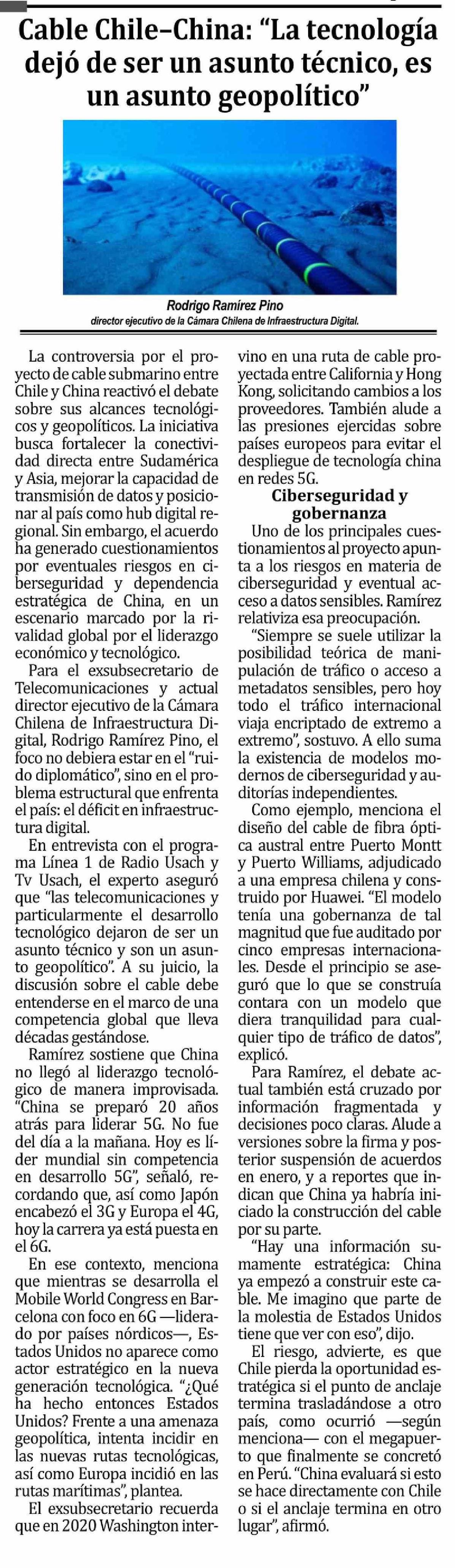 Columnas de Opinión: Cable Chile-China: "La tecnología dejó de ser un asunto técnico, es un asunto geopolítico"