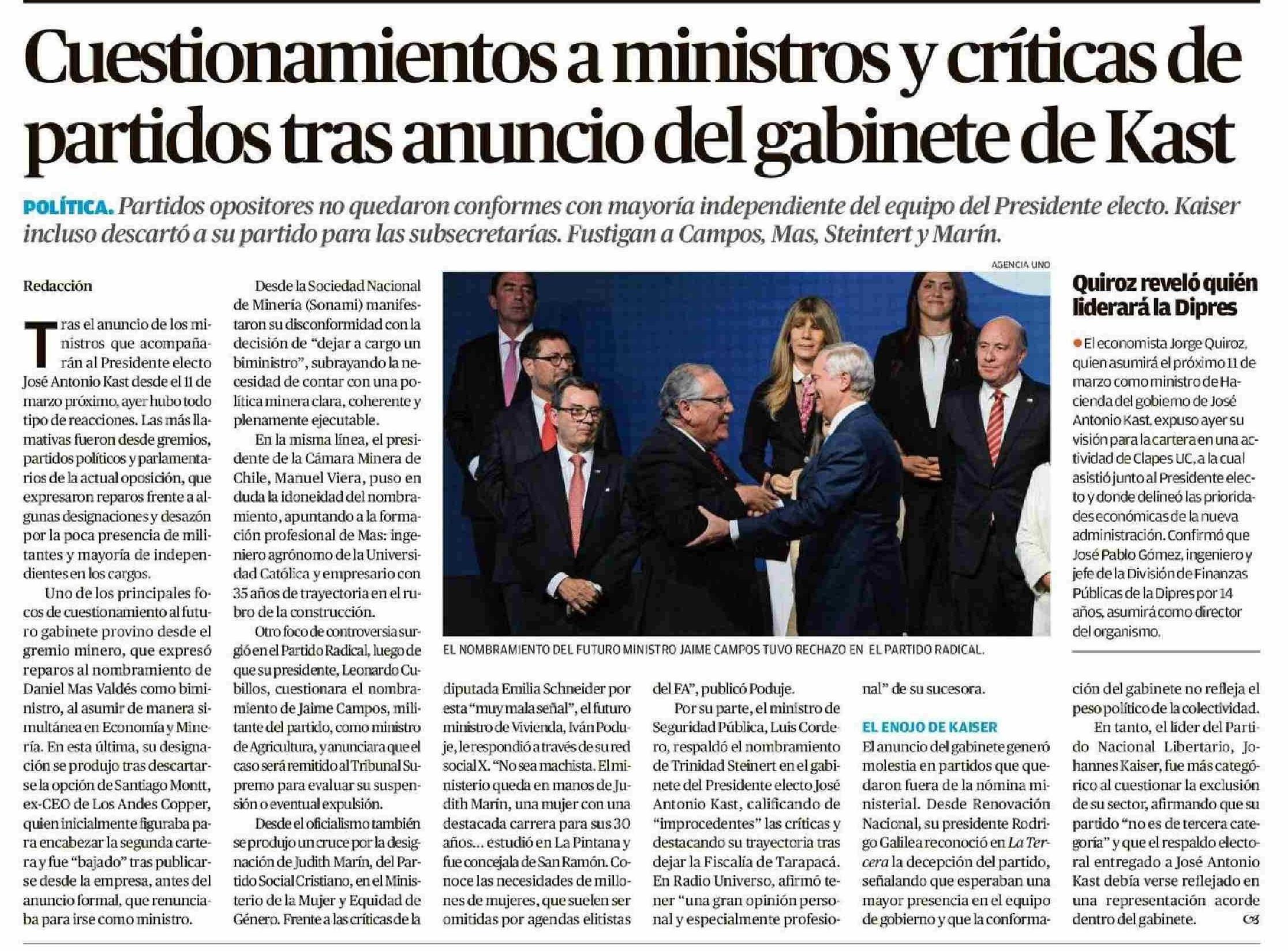 Cuestionamientos a ministros y críticas de partidos tras anuncio del gabinete de Kast