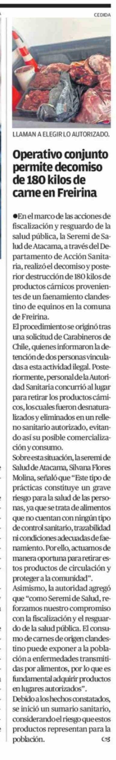 Operativo conjunto permite decomiso de 180 kilos de carne en Freirina