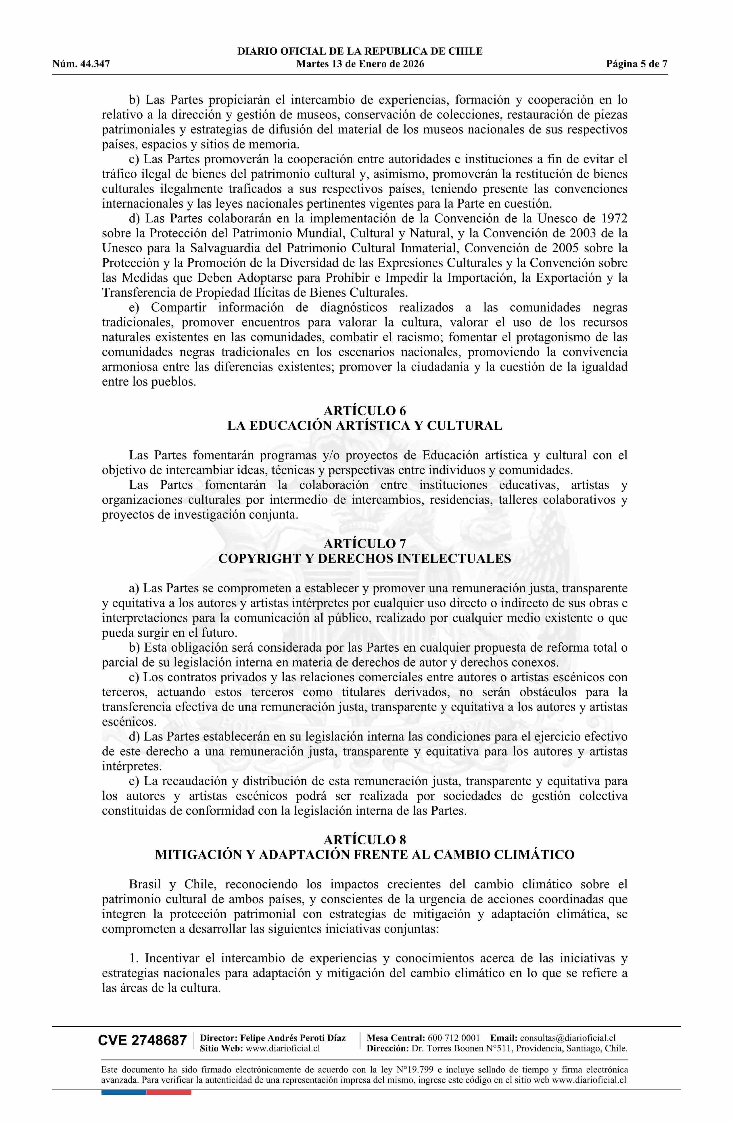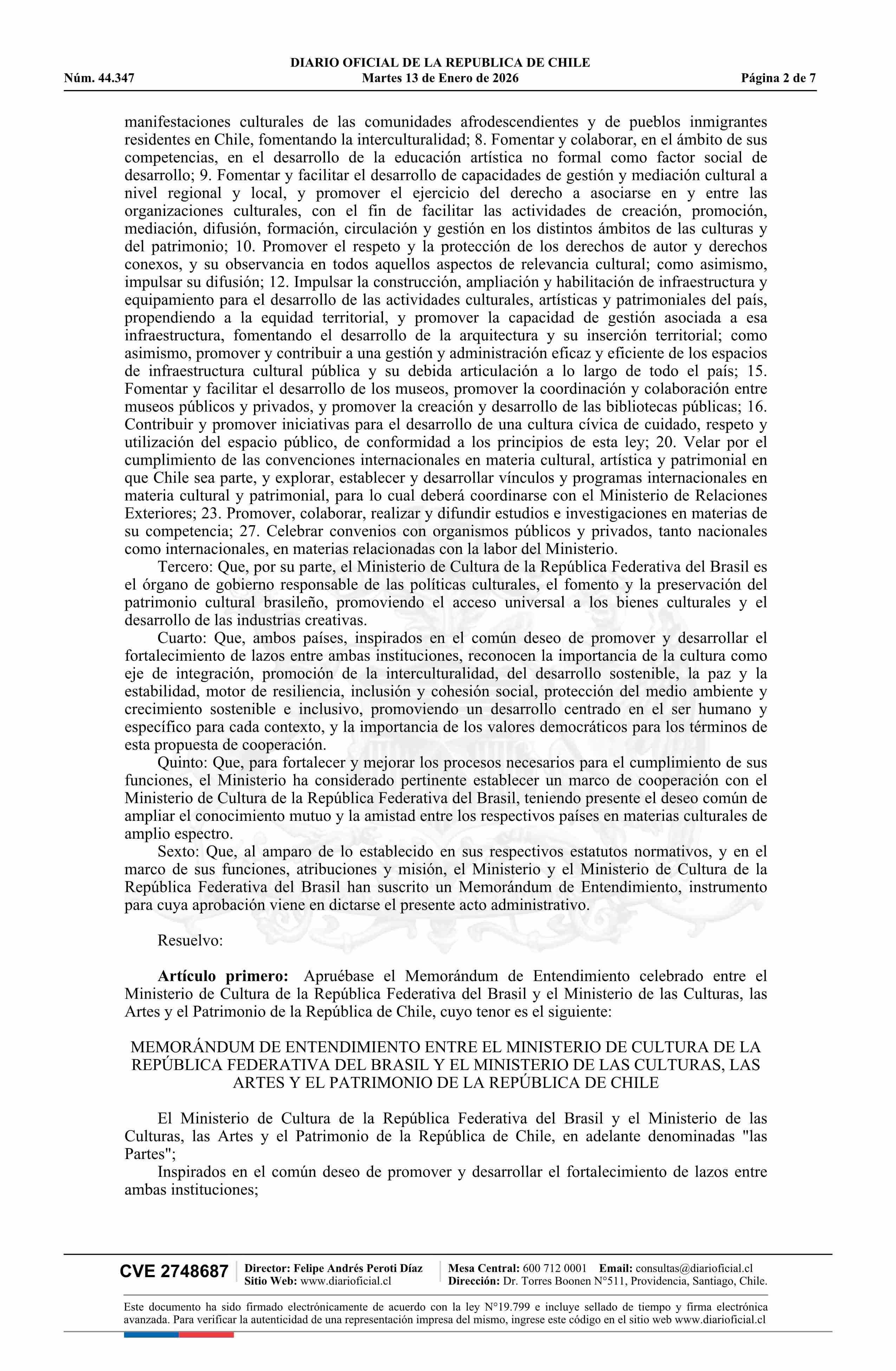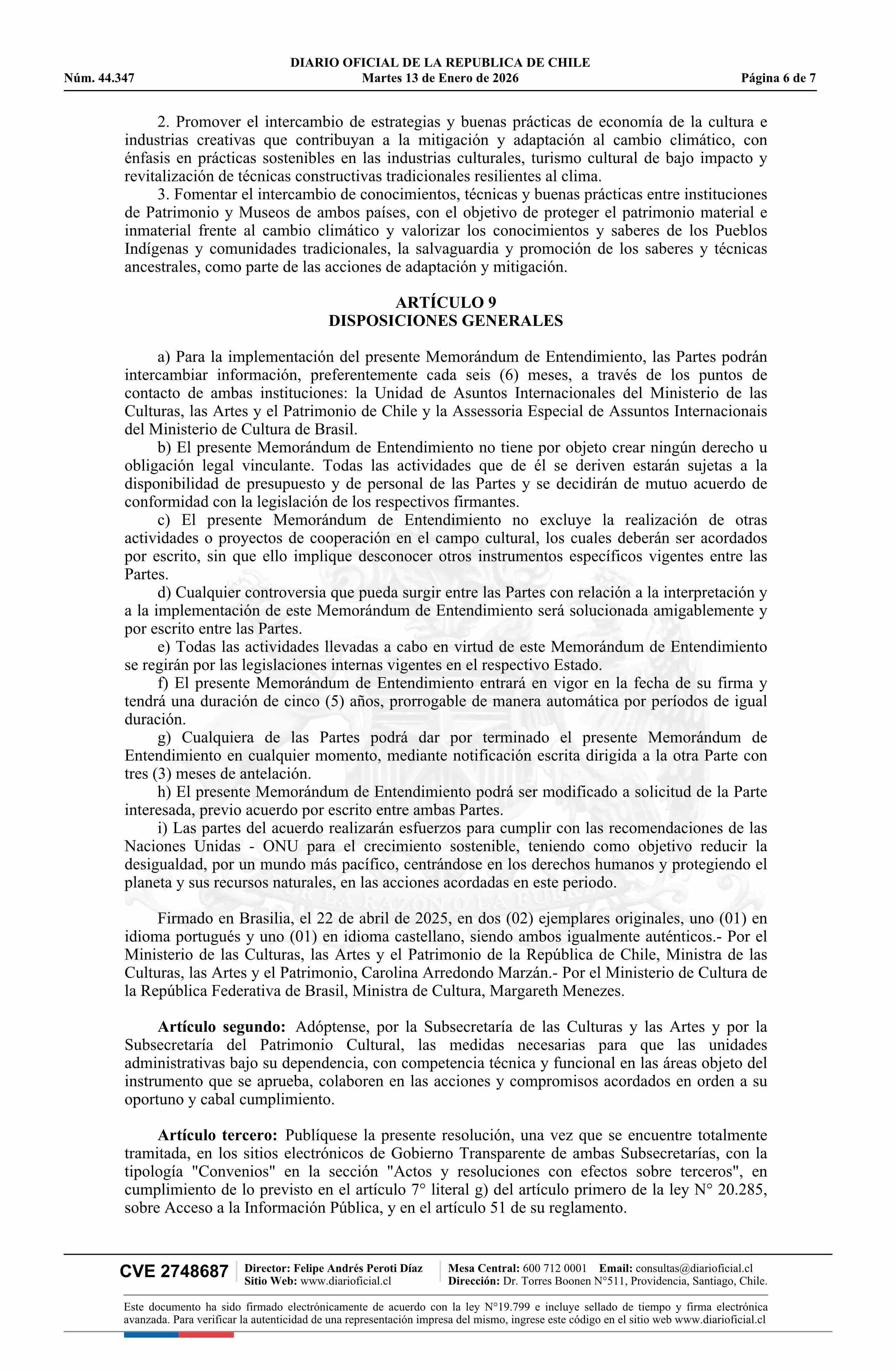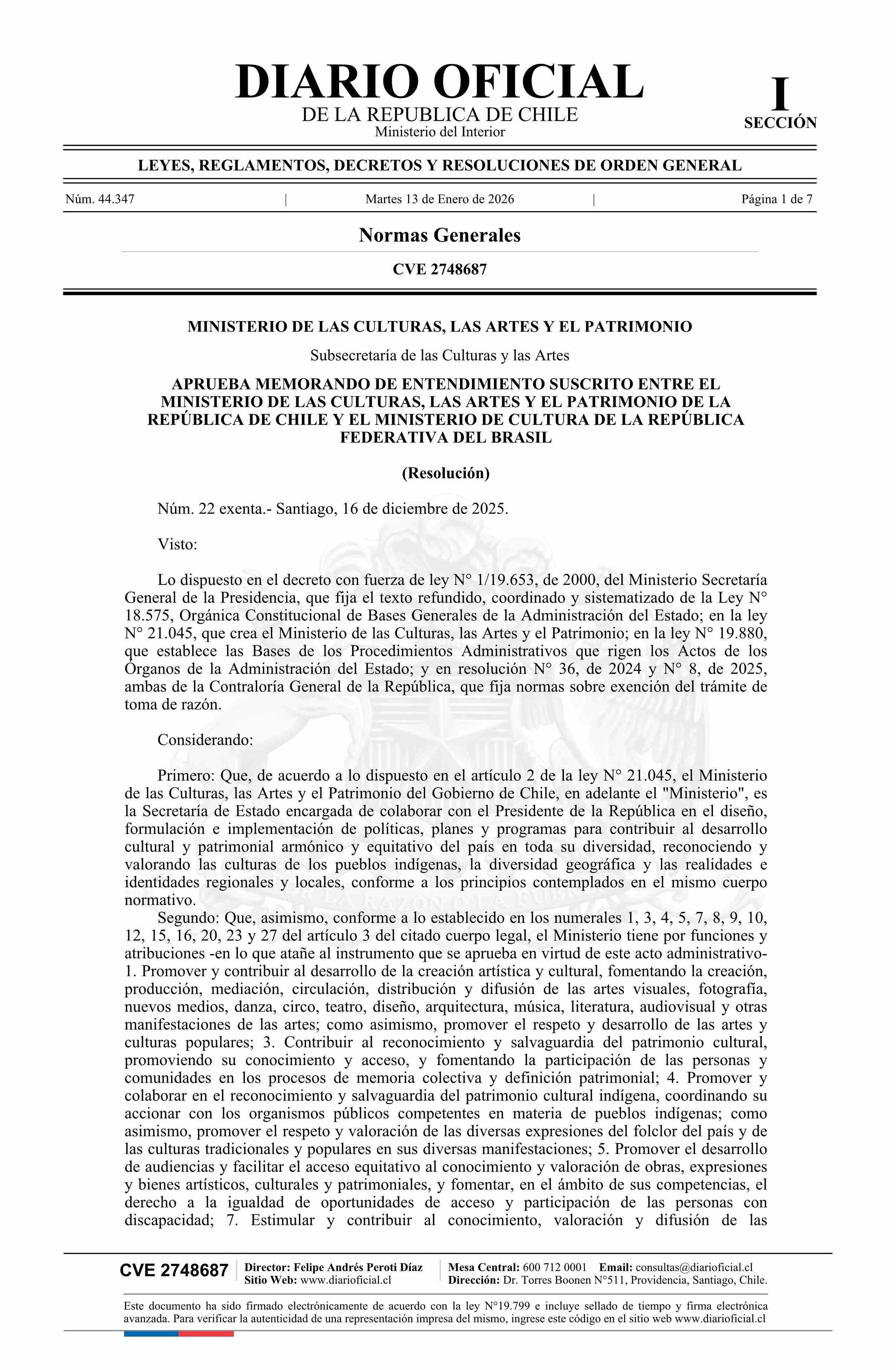 | Título: | Resolución exenta número 22, de 2025.- Aprueba Memorando de Entendimiento suscrito entre el Ministerio de las Culturas, las Artes y el Patrimonio de la República de Chile y el Ministerio de Cultura de la República Federativa del Brasil |