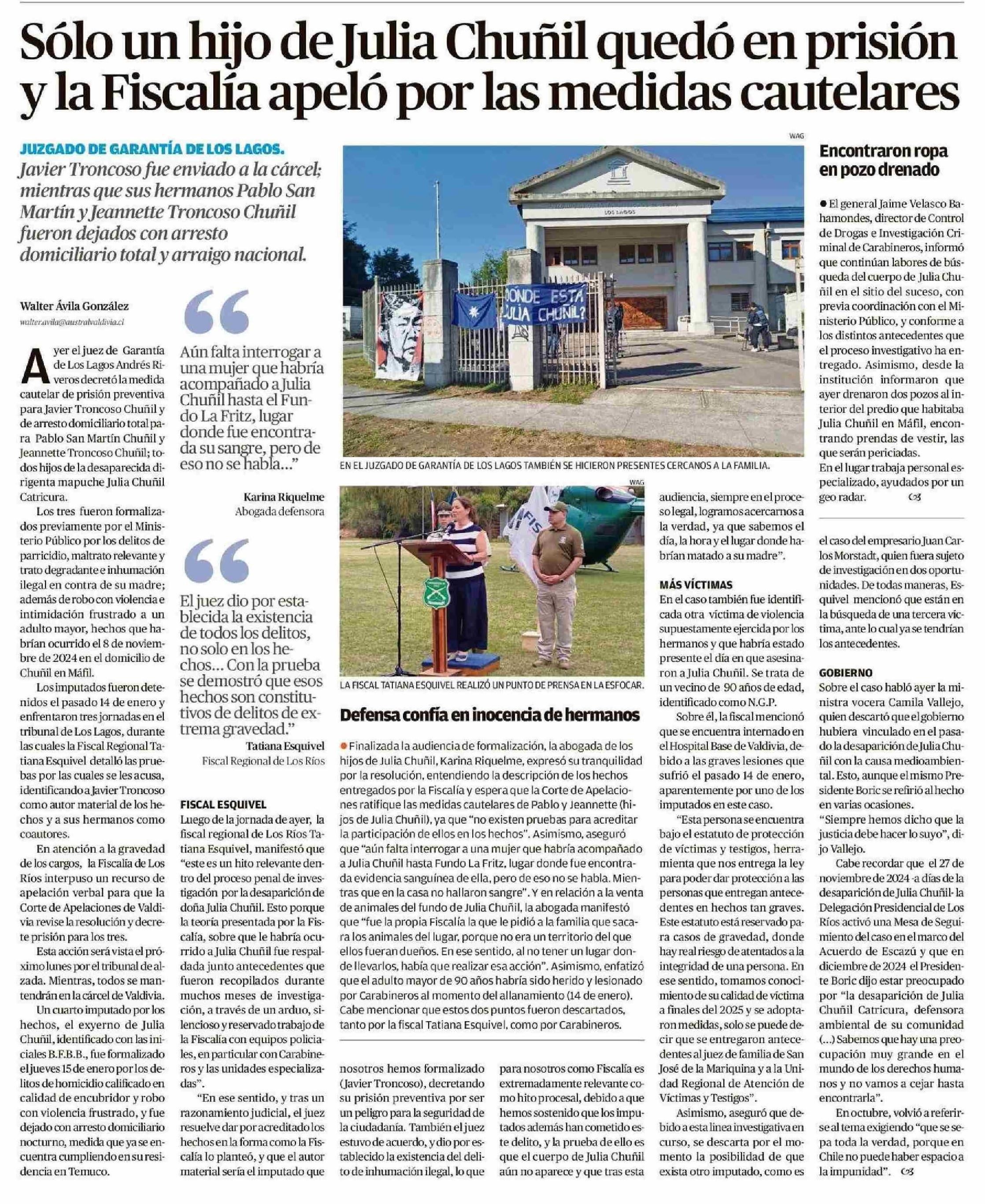Sólo un hijo de Julia Chuñil quedó en prisión y la Fiscalía apeló por las medidas cautelares