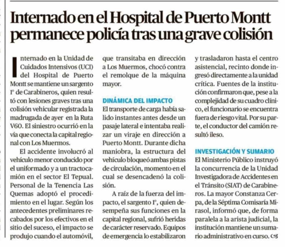 Internado en el Hospital de Puerto Montt permanece policía tras una grave colisión