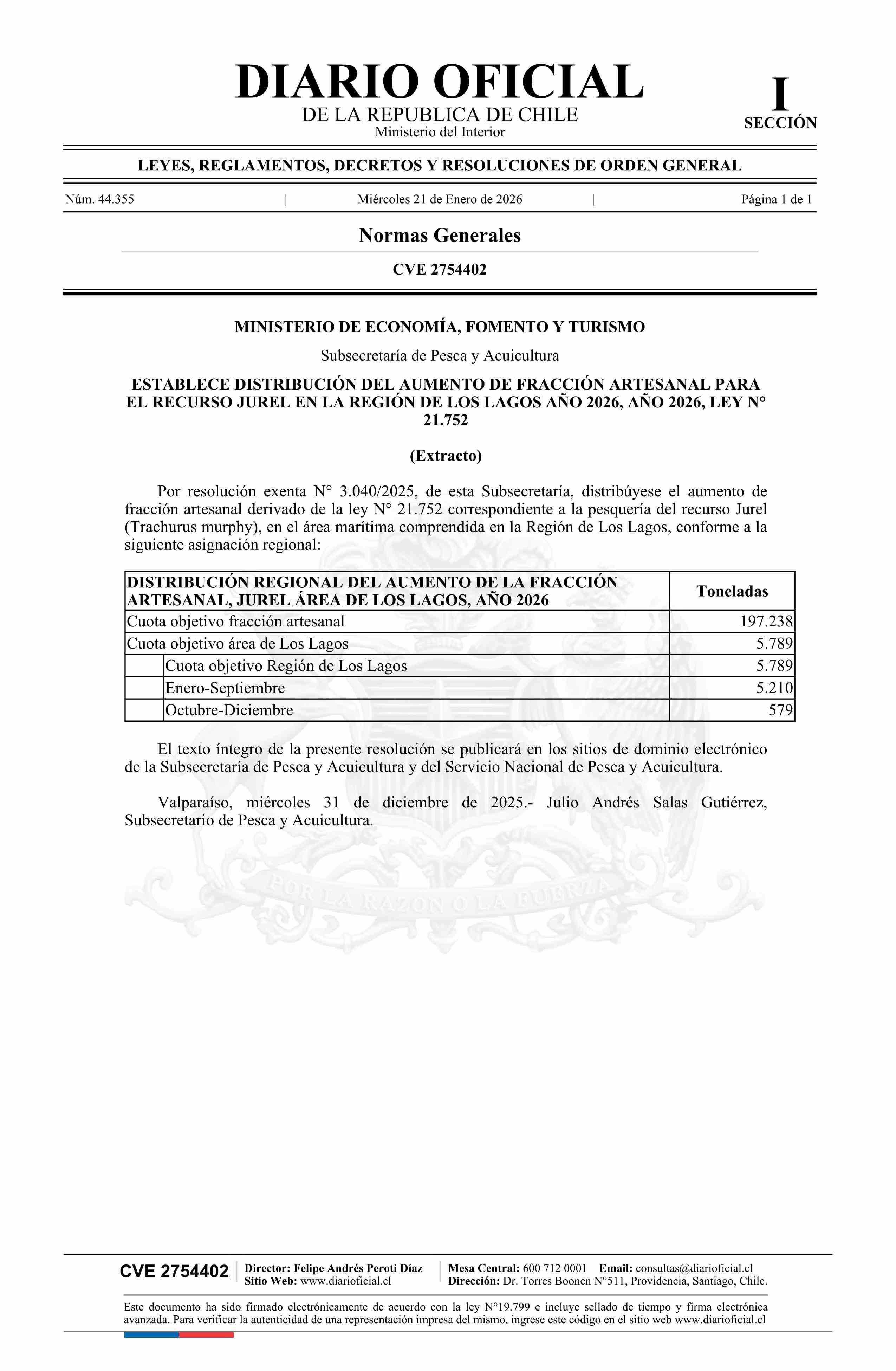 | Título: | Extracto de resolución exenta número 3.040, de 2025.- Establece distribución del aumento de fracción artesanal para el recurso Jurel en la Región de Los Lagos, año 2026, ley N° 21.752 |