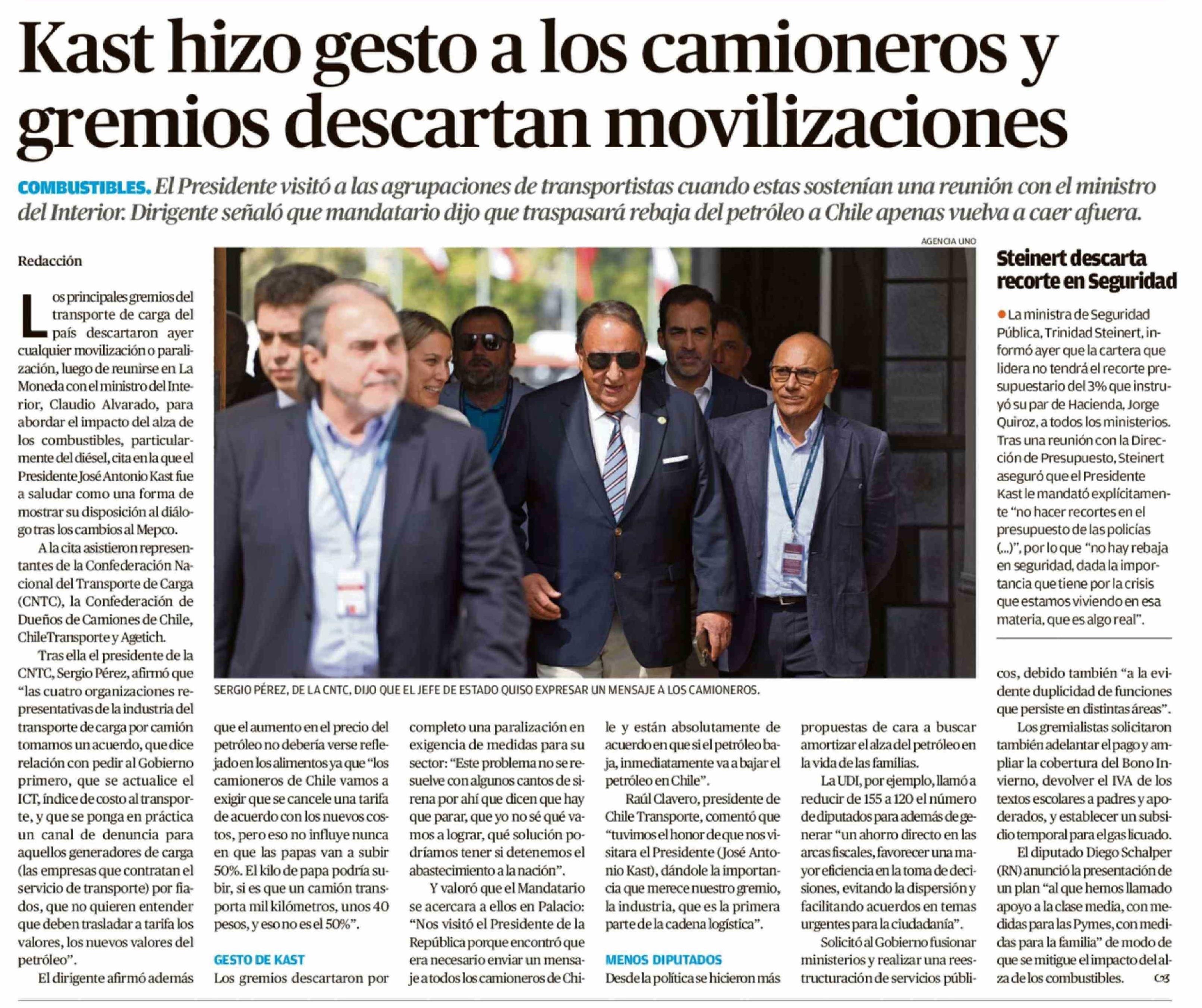 Kast hizo gesto a los camioneros y gremios descartan movilizaciones