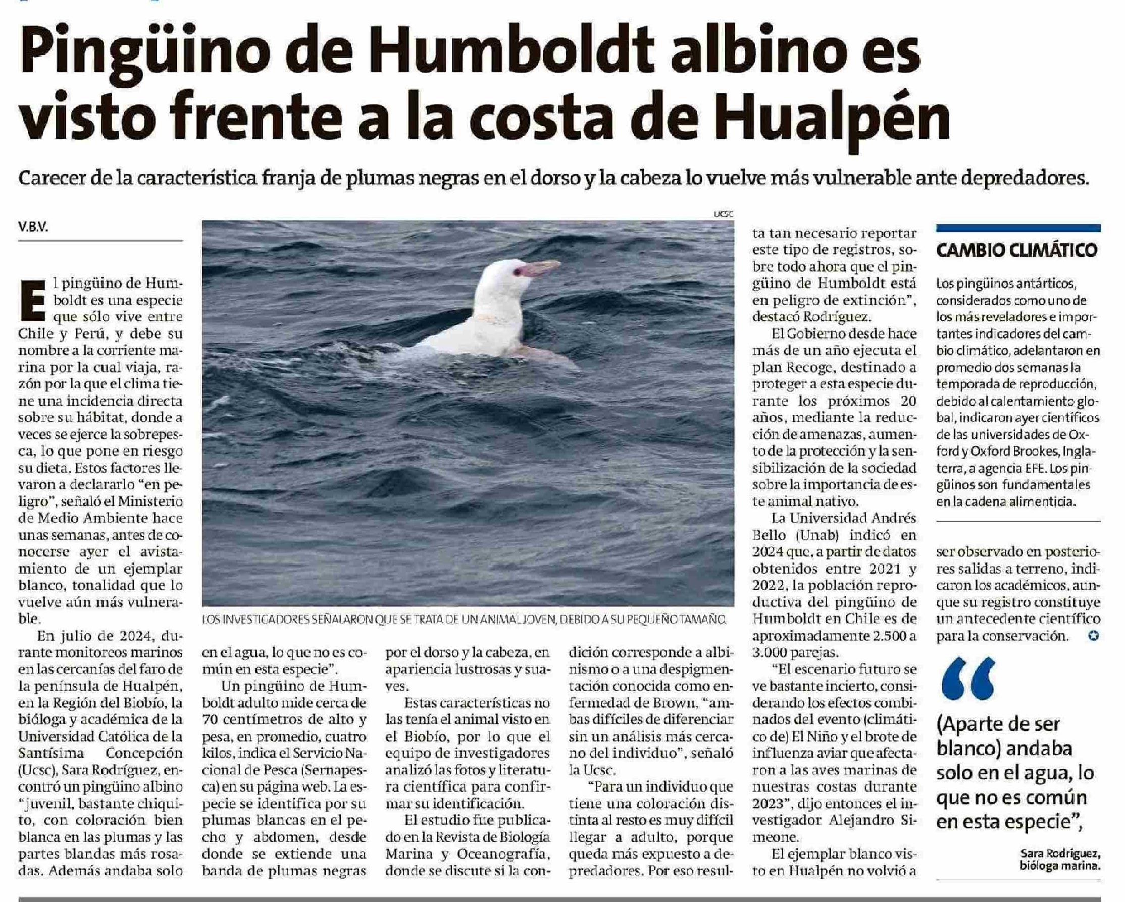 Pingüino de Humboldt albino es visto frente a la costa de Hualpen