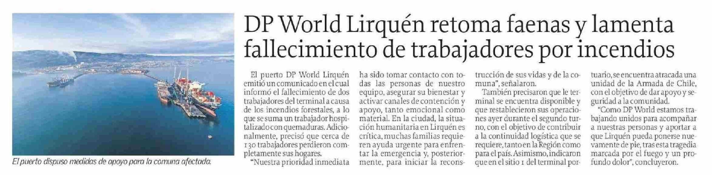 DP World Lirquén retoma faenas y lamenta fallecimiento de trabajadores por incendios