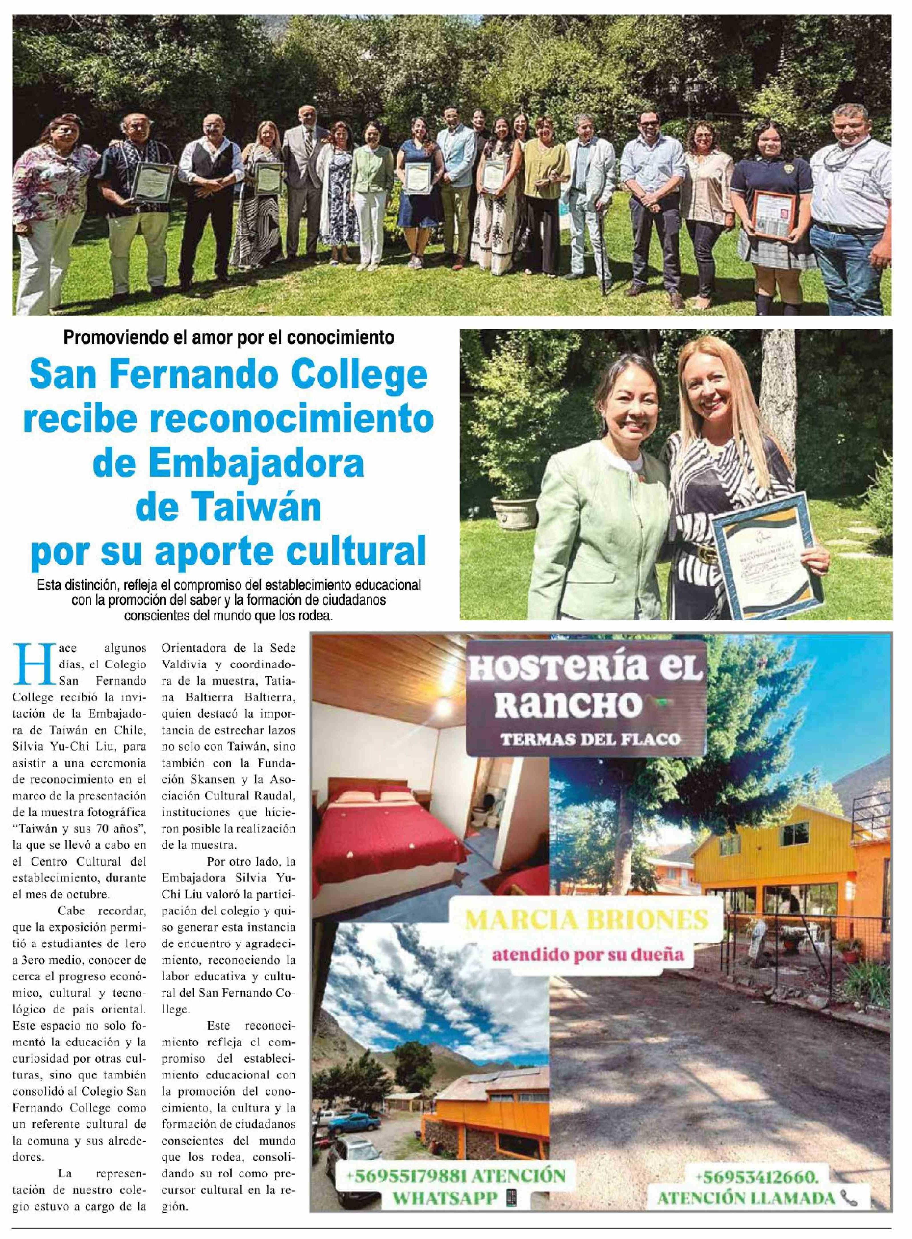 San Fernando College recibe reconocimiento de Embajadora de Taiwán por su aporte cultural