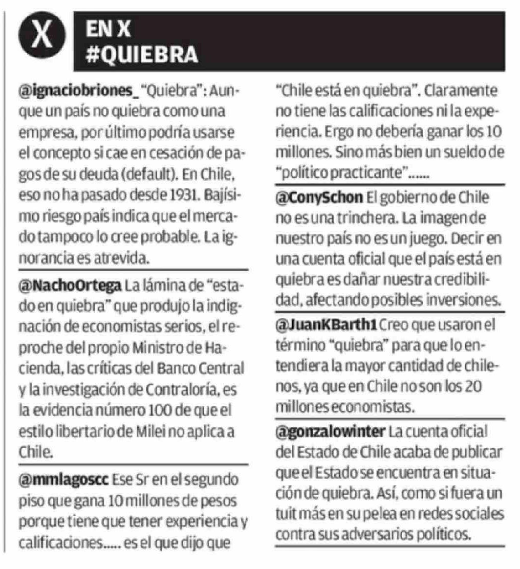 Título: @ignaciobriones_"Quiebra": Aunque un país no quiebra como una empresa, por último podría usarse el concepto si cae en cesación de pagos de su deuda (default). En Chile, eso no ha pasado desde 1931. Bajísimo riesgo país indica que el mercado tampoco lo cree probable. La ignorancia es atrevida. @Nacho
