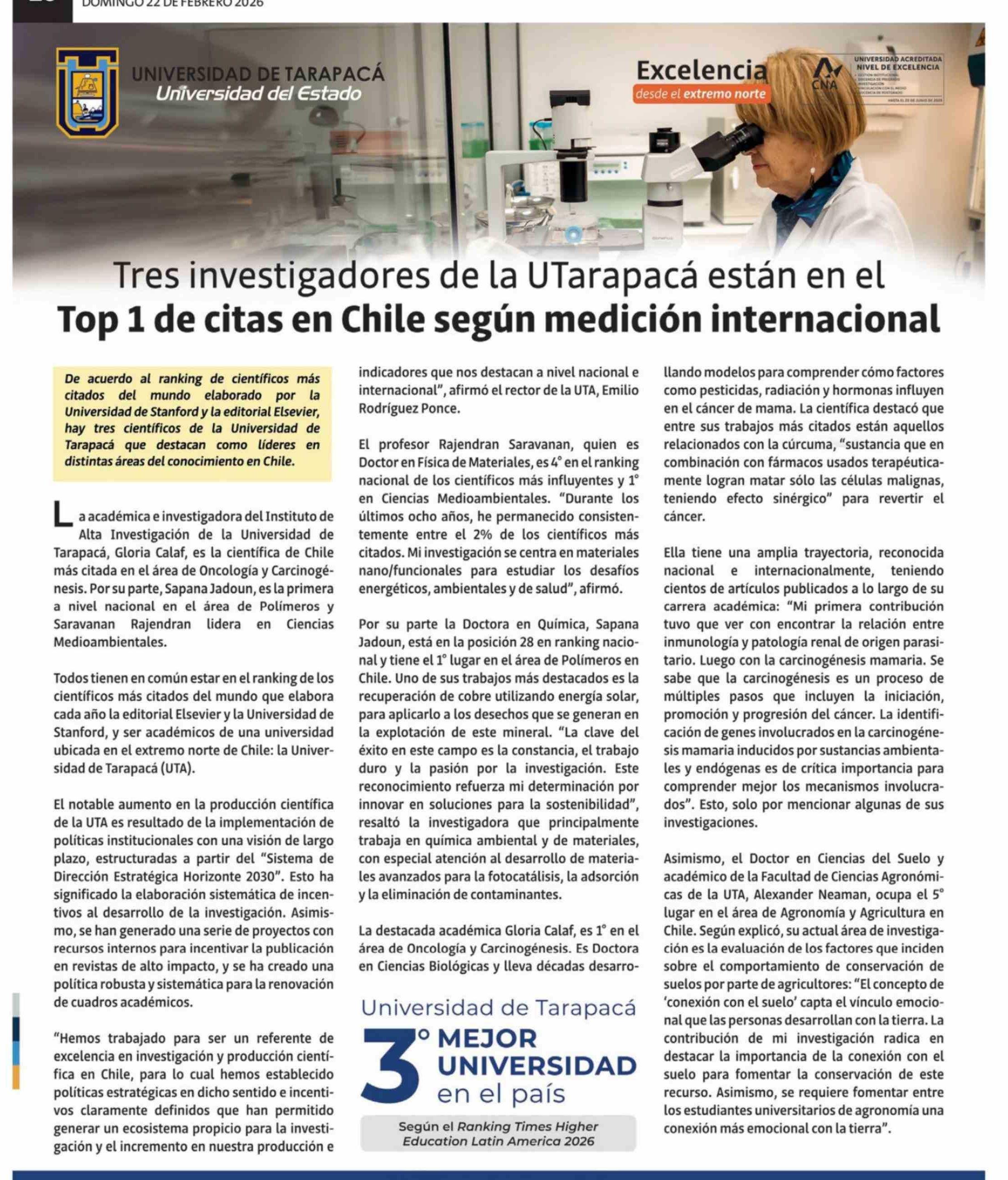 Tres investigadores de la UTarapacá están en el Top 1 de citas en Chile según medición internacional