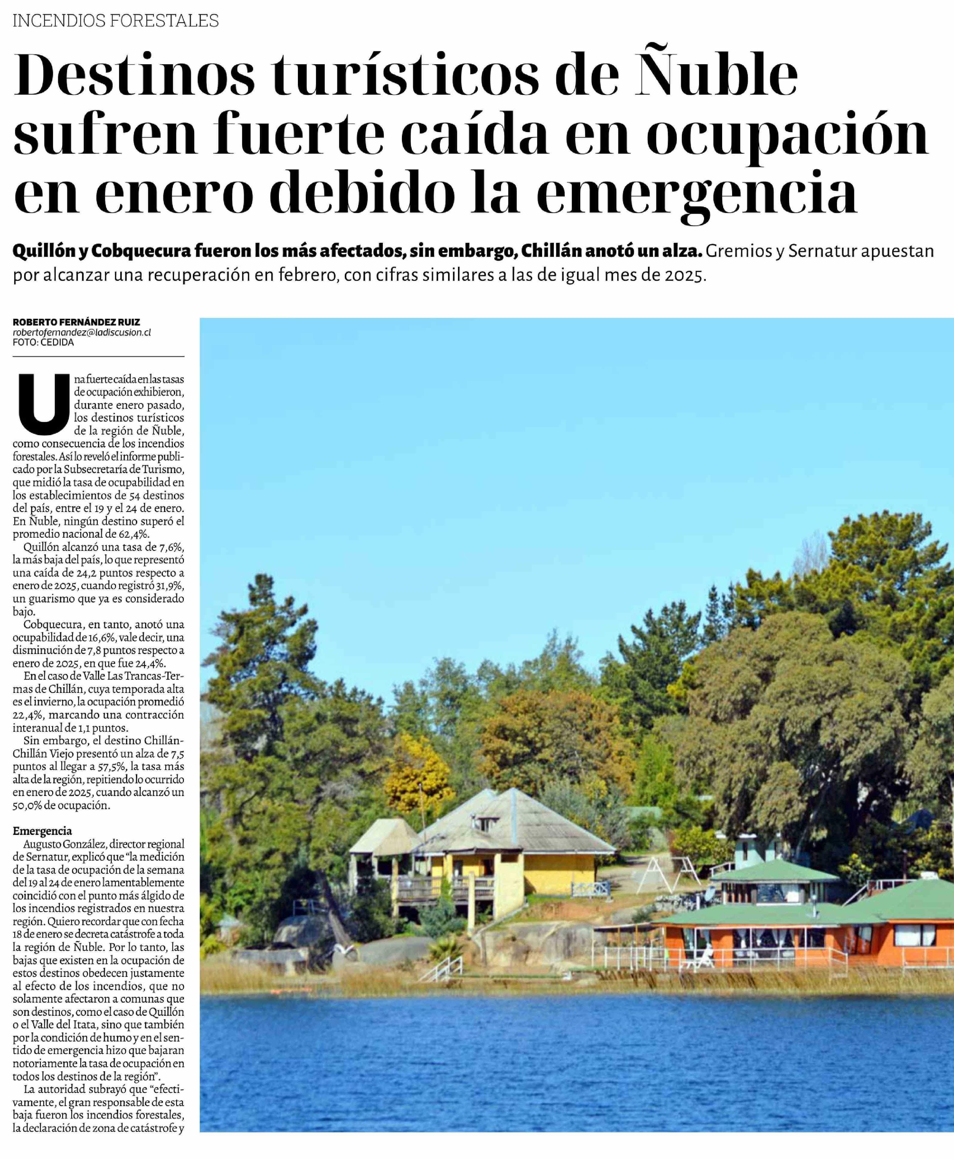 Destinos turísticos de Ñuble sufren fuerte caída en ocupación en enero debido la emergencia