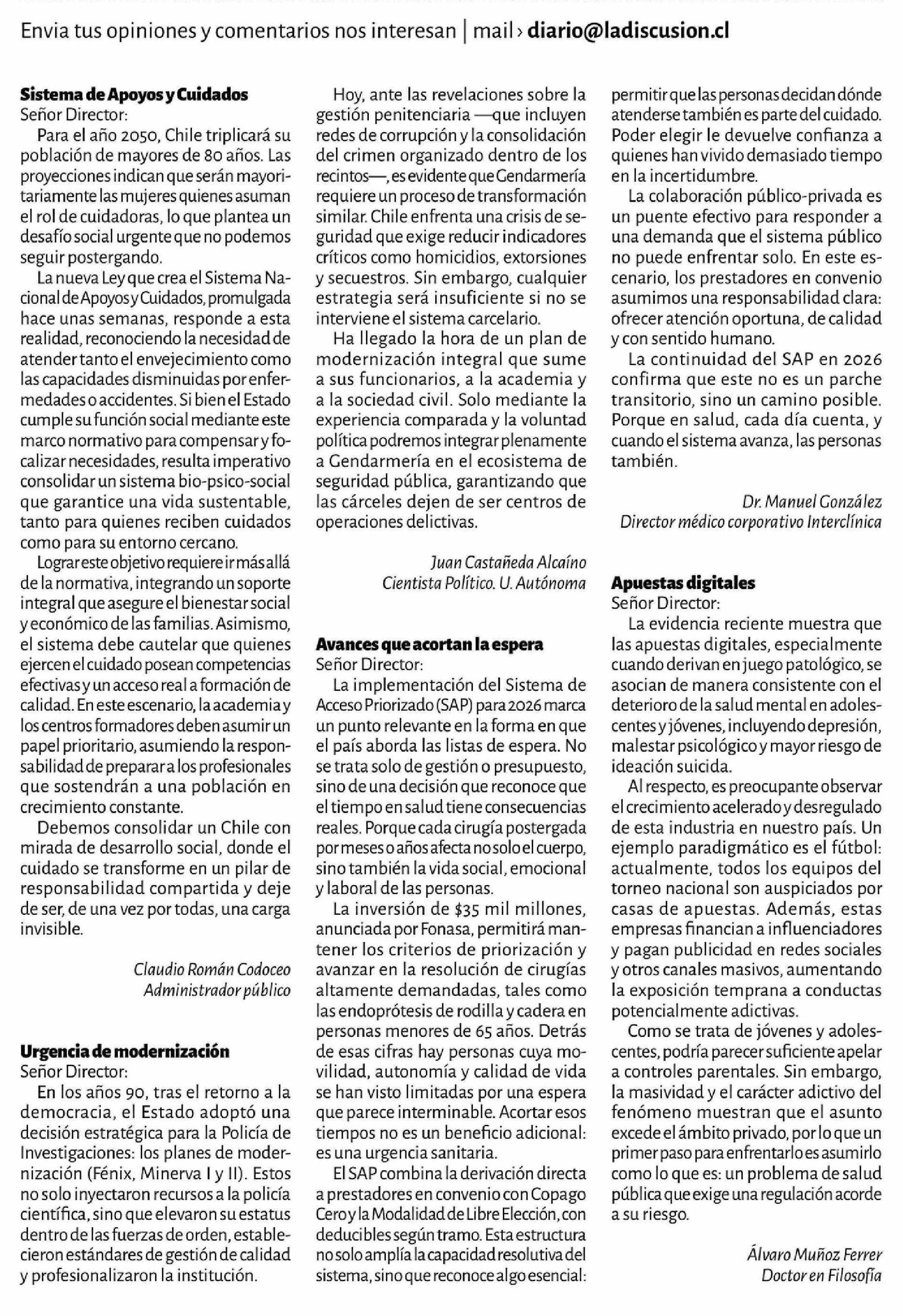 | Título: | Cartas: Sistema de Apoyos y Cuidados Señor Director: Para el año 2050, Chile triplicará su población de mayores de 80 años. Las proyecciones indican que serán mayoritariamente las mujeres quienes asuman el rol de cuidadoras, lo que plantea un desafío social urgente que no podemos seguir postergando. |