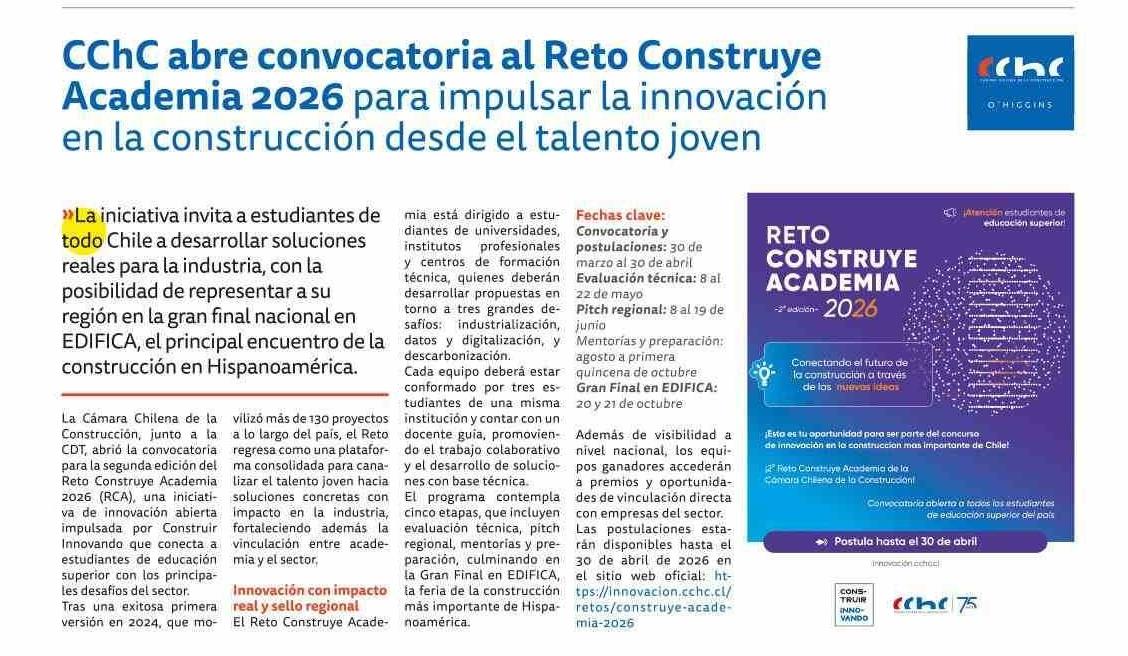CChC abre convocatoria al Reto Construye Academia 2026 para impulsar la innovación en la construcción desde el talento joven