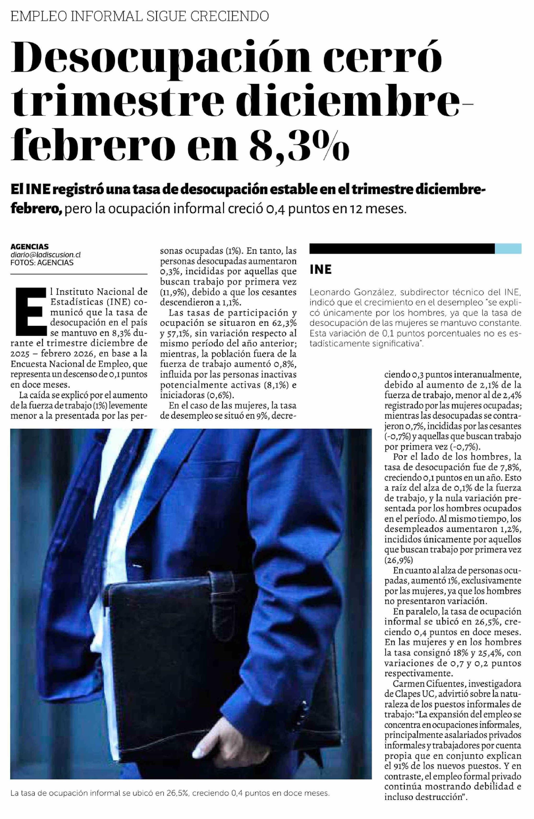 Desocupación cerró trimestre diciembre febrero en 8,3%